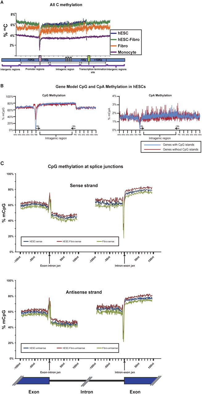 (A) Average distribution of DNA methylation mapped onto a gene model. Overall methylation levels at the TSS (transcription start site) region were lower in hESCs compared to the differentiated cell types. (B) The CpG and CpA methylation distribution surrounding genes with and without CpG islands (CpI), shown for hESCs. CpG and CpA methylation levels were lower at the TSS region in both genes with and genes without CpG islands at the promoter. However, the level of methylation was lower for genes with promoters containing CpG islands. Promoters without CpG islands showed a peak of CpG methylation ∼1.5–5.0 kb upstream of the TSS. Data for all cell types are shown in Supplemental Figure 7. (C) CpG methylation across splice junctions. The percent of mCpG across a 100-bp window spanning the exon/intron junctions was mapped. Both sense (upper panel) and antisense (lower panel) strands showed a sharp spike in CpG methylation at the exon/intron junction, followed by a steep decrease in methylation that gradually increases with proximity to the next exon. Another sharp spike, of decreased methylation in this case, is followed by a steep rise in methylation as the next exon begins.