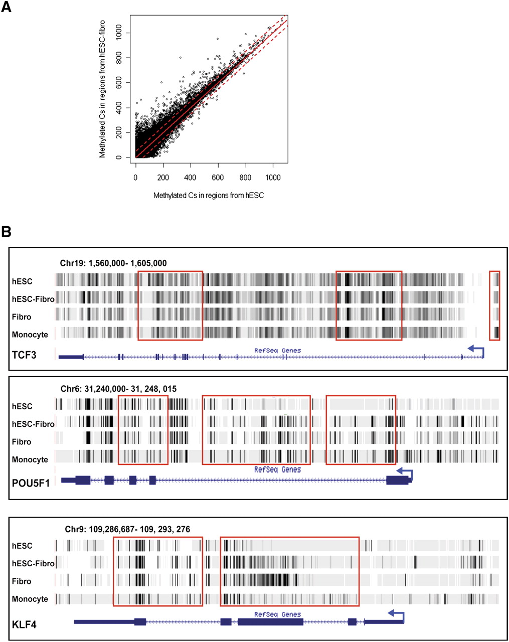 Differentially methylated regions (DMRs) in hESCs and hESC-Fibros. (A) Scatterplot of methylation level in hESCs (x-axis) versus in hESC-Fibro (y-axis). The red line indicates the cutoff of 5 SDs. The distribution is very similar in the two cell types, with a correlation coefficient of 0.879. (B) Examples of DMRs found in the pluripotence-associated transcription factors TCF3, POU5F1, and KLF4.