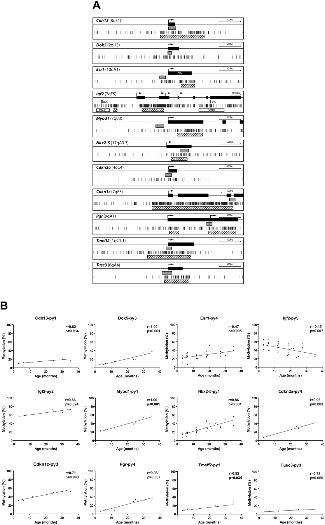 Methylation profiles by pyrosequencing analysis. (A) Gene structure and CpG sites analyzed. Maps represent 3.5 kb of sequence around CpG islands (hatched boxes) and exons (black boxes) of genes analyzed in this study. Short vertical bars represent CpG sites. Arrows point to transcriptional start sites. Gray boxes represent amplified regions for pyrosequencing (py). (B) Association of the percentages of methylated cytosines in the samples as obtained from pyrosequencing (y-axis) with age (x-axis) for 12 genes. The Spearman test was used to determine correlations, with significance set at P < 0.05. R represents a measure of the linear relationship between two variables, and varies from −1 to +1.