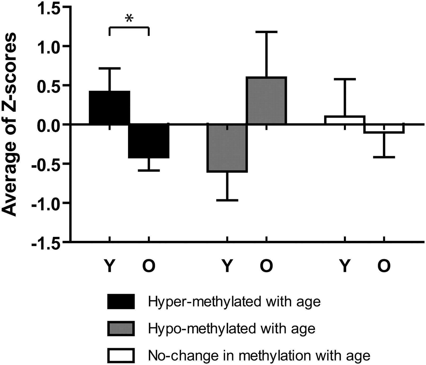 Age-related changes in mRNA expression in large intestine. Expression was measured for four genes showing age-related hypermethylation (Gpr37, Hoxa11, Pcdh10, and Prdm5), one showing age-related hypomethylation (P2rx7) and two (Tmp2 and Cpe) showing unchanged methylation with age. The expression data for each gene was Z-score transformed, and we averaged values for hyper/hypo/unchanged methylation. Black and gray solid bars represent the expression level of hypermethylated and hypomethylated genes with age. (Y) Young tissues; (O) old tissues. Bars represent standard error. *P < 0.05