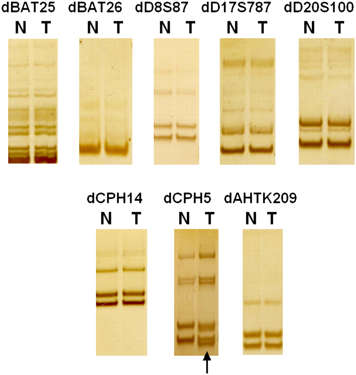 MSI assay of the dog tumors. A total of eight dog microsatellite loci were analyzed as described in the text, with the top five being homologs of frequently used human MSI markers (Boland et al. 1998) and the bottom three being dinucleotide markers used by McNiel et al. (2007) to determine MSI status in canine mammary gland neoplasia. The extra band that the tumor displayed for the locus CPA5 was indicated by an arrow. T, tumor; N, its matching normal.
