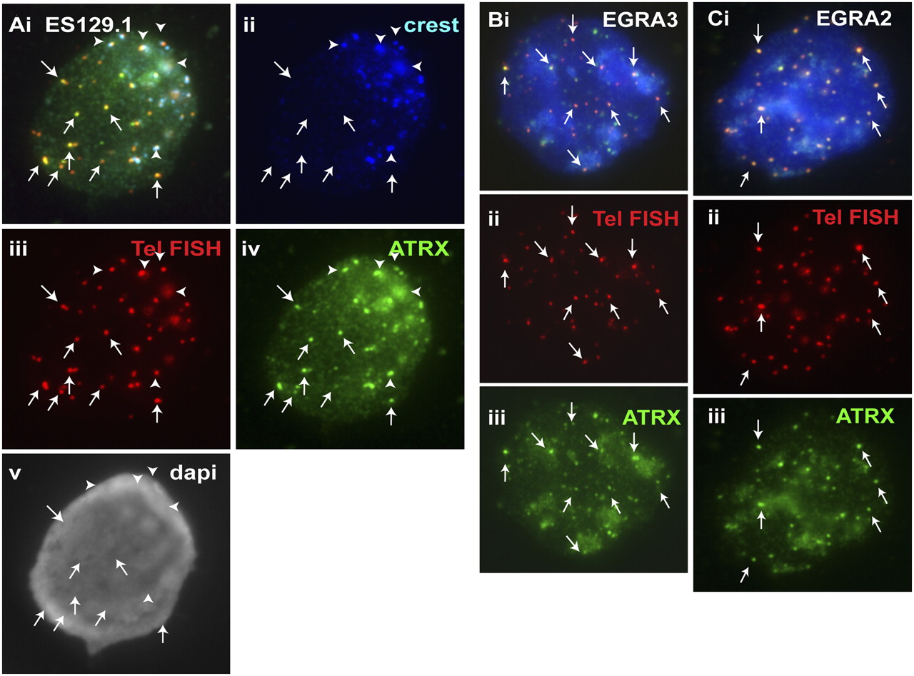 Cellular distribution of ATRX in mouse ES cell lines ES129.1 and W9.5 and in mouse EG cell lines EGRA2 and EGRA3. (A) In interphase ES129.1 cells, a triple-staining immunofluorescence analysis showed clear colocalization of ATRX (iv, green) with telomere FISH signals (iii, red), without any CREST signal (arrows). ATRX localization at pericentric heterochromatin was indicated by its close proximity to the centromeric CREST staining (ii, blue; arrowheads). (B,C) In interphase EGRA3 and EGRA2 cells, ATRX (Biii,Ciii, green) was similarly enriched at the telomeres (arrows). Telomeric localization of ATRX (Biii,Ciii, green) was confirmed by telomere FISH (Bii,Cii, red).