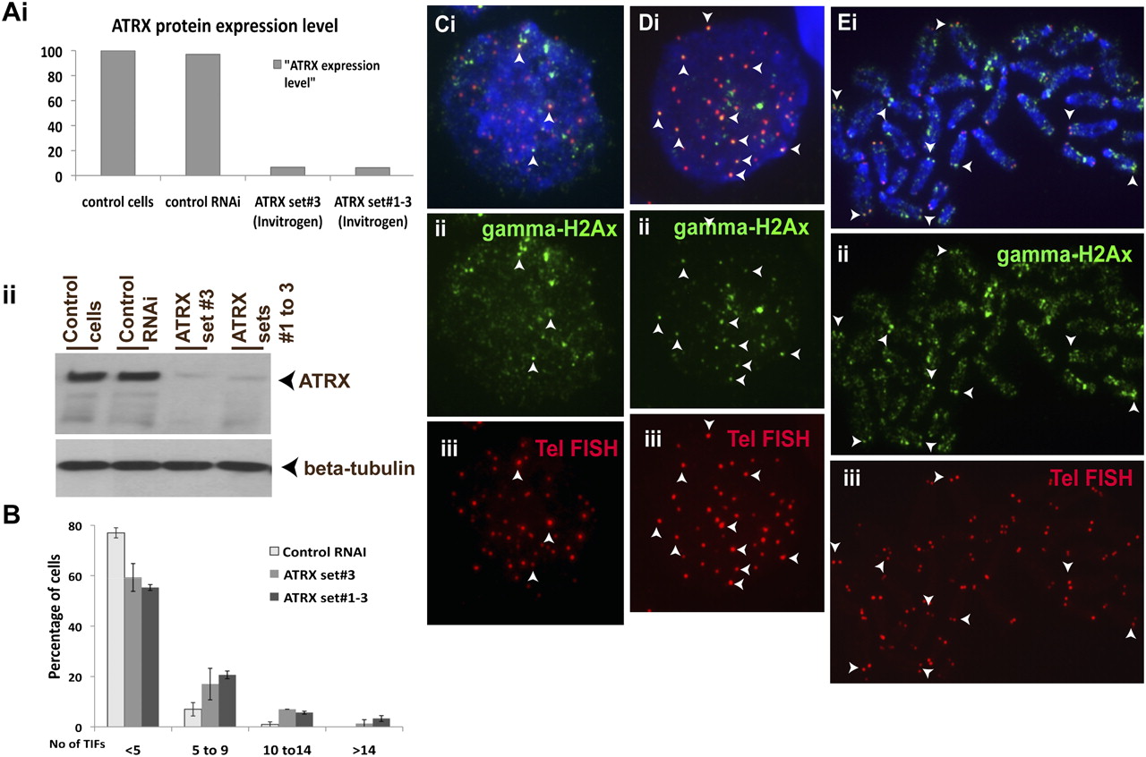 Effect of ATRX RNAi-knockdown on telomere integrity in mouse ES cells. (A) Western blot analysis of ES129.1 cells transfected with ATRX-specific RNAi oligonucleotide sets (set 3 and sets 1–3 from Invitrogen) using anti-ATRX and anti-beta-tubulin antisera. (i) Data are presented in histograms by normalization of the intensity of ATRX levels against the intensity of beta-tubulin levels. (ii) ATRX RNAi-depleted cells showed a significant reduction of ∼90% in ATRX protein level (arrows; lanes 3,4) 48 h after the transfection, compared with nontransfected cells (lane 1) and cells transfected with scrambled control RNAi oligonucleotides (lane 2). The equal loading of protein was achieved by normalization against the beta-tubulin level. (B) Induction of TIFs by ATRX-inhibition using ATRX RNAi oligonucleotide (set 3 and sets 1–3 from Invitrogen and set 2 from Ambion, respectively) for 48 h. Data are presented in histograms by subgrouping the cells according to the number of TIFs per cell (less than five 5 TIFs, five to nine TIFs, 10 to 14 TIFs, and more than 14 TIFs). A normal cell can contain one to two TIFs on average; thus, a threshold of four or more TIFs was used, as described in other studies (Hockemeyer et al. 2005). When transfected with ATRX-RNAi oligonucleotides, the number of cells with five or more TIFs (85 cells were counted for each experiment) by three- to fourfold (increased from 9.41% to as high as 29.8%–34.90%, with an average increase of 20.39%–25.49%). In this study, we only counted the number of TIFs in interphase ES129.1 cells although in some metaphase cells, TIFs were also present at the telomeres following RNAi-depletion of ATRX. We also performed RNAi-knockdown using ATRX-specific RNAi oligonucleotide sets purchased from Ambion, showing a significant reduction of ∼80% in ATRX protein level and a fivefold increase in the number of cells with five or more TIFs 48 h after the transfection (see Fig. S7). (C–E) Immunofluorescence analysis of ES129.1 cells subjected to 48-h knockdown with either control (C) or ATRX-specific (D,E) RNAi-duplex oligonuclotides using anti-gamma-H2AFX (Cii,Eii; green) antiserum. Increased number of TIFs was detected at telomeres (indicated by telomere FISH analysis; Diii,Eiii) in cells depleted of endogenous ATRX (arrowheads show some examples of TIFs).
