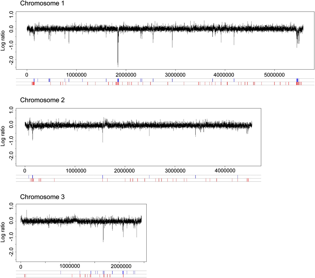 Differences in the histone H3 occupancy over the entire genome, before and after nitrogen starvation. The genomic position in base pairs from the left end of each chromosome is shown on the x-axis and the H3 occupancy log2 ratio on the y-axis. Regions with a significant histone H3 depletion 20 min after nitrogen starvation are shown in blue at the bottom; up-regulated genes are shown in red.