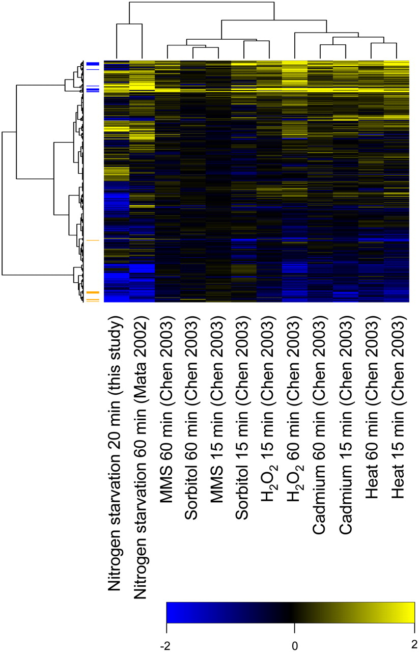 Hierarchical clustering of stress response gene expression data. The clustering includes 4145 genes (rows) under 12 different stress conditions (columns). Colors indicate gene expression log ratios compared to relevant controls; (yellow) up-regulation; (blue) down-regulation. The 20-min nitrogen starvation data are from the present investigation and the other data are from Mata et al. (2002) and Chen et al. (2003). At left, CESR-induced genes are labeled in blue, and CESR-repressed genes in orange.