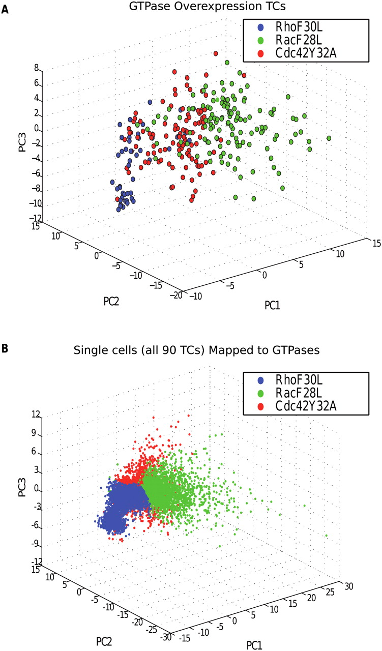 Point sets for RhoGTPase overexpression TCs and corresponding phase space. Point sets for RhoGTPase overexpression TCs and classification of all single cells in the double-knockdown screen. (A) Point sets for RhoF30L (blue), RacF28L (green), and Cdc42Y32A (red) shown in reduced-dimensional feature space. (B) The mapping of all 6480 single cells from the double-knockdown RhoGAP screen to RhoGTPase overexpression TCs. In effect, the classification model defines a phase space for mapping single cells in the set of upstream TCs to the set of downstream TCs.