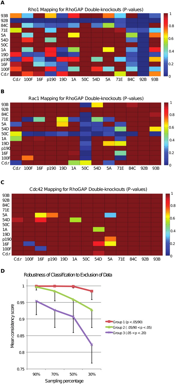 Mapping of RhoGAP double-knockdown TCs to RhoGTPase overexpression TCs. (A–C) Significance score for mapping of all single- and double-knockdown RhoGAP TCs to the RhoF30L, RacF28L, and Cdc42Y32A TCs, respectively. The color scale ranges from blue (highly significant mapping) to red (low significance). For example, the RacGAP50C/RacGAP84C double-knockdown TC was mapped to RacF28L with high significance (see also Supplemental Table 3). (D) Robustness of classification to exclusion of data using jackknifing. For each single- and double-knockdown TC, 100 random samples consisting of X% (X = 30, 50, 70, 90) of the cells from that TC were selected and classified to the set of overexpression TCs. A consistency score was assigned based on the fraction of random samples correctly classified. Single- and double-knockdowns were binned into groups depending on the P-score of the true classification. Mean and standard deviations of consistency scores are shown here for the three groups defined by largest P-scores (see graph legend). Most importantly, high-confidence classifications are extremely robust to data exclusion (top line in graph). See Supplemental Table 8 for full jackknife results and Methods for discussion of further robustness testing.