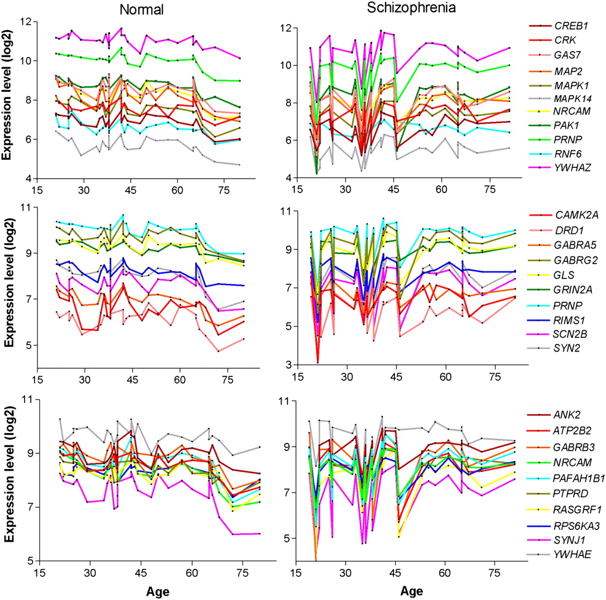 Expression coregulation of CNS developmental- and dopamine signaling–related genes and the effect of age on gene expression levels. The expression level of each gene (right of graphs) in individual subjects is depicted in chronological order by age. (Left) Normal subjects; (right) subjects with schizophrenia. (Top panels) Genes related to neurite outgrowth; (middle panels) genes related to dopamine synaptic transmission; (bottom panels) genes related to neuronal differentiation, morphogenesis, and migration. Pearson correlation coefficients (Pearson r-values) for the linear association with age in normal subjects and those with schizophrenia are provided in Table 3.