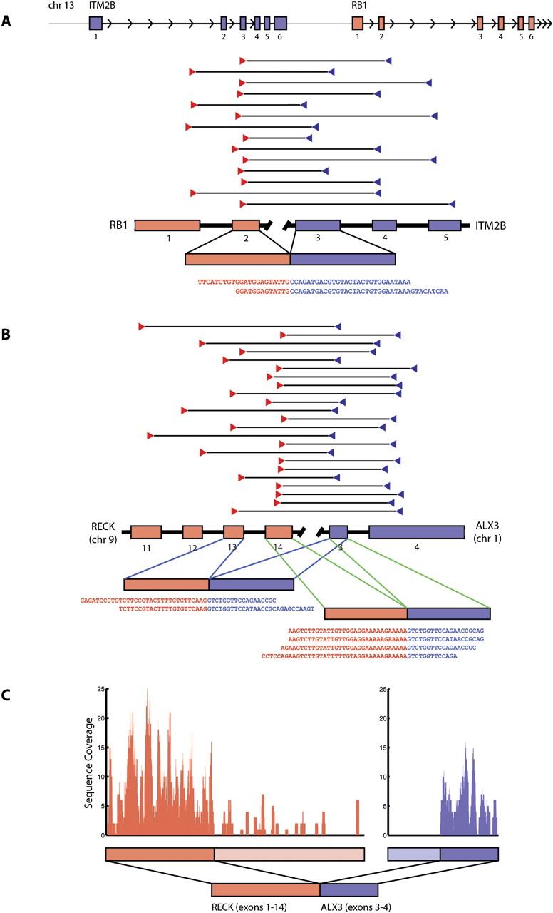 Gene fusions in melanoma. (A) RB1-ITM2B gene fusion in short-term culture M990802. ITM2B is transcribed immediately upstream of RB1 on chromosome 13, yet in M990802, a fusion transcript beginning with the 5′ end of RB1 and ending with the 3′ end of ITM2B is implicated by 14 distinct read pairs and two individual fusion-spanning reads. (B) RECK-ALX3 gene fusion in short-term culture M000921. Two alternate transcripts are observed in the RNA-seq data: One joining exon 13 of RECK to exon 3 of ALX3, and one joining exon 14 of RECK to exon 3 of ALX3. (C) Spatial distribution of sequence reads for RECK and ALX3 are consistent with a fusion transcript containing the 5′ end of RECK and the 3′ end of ALX3.