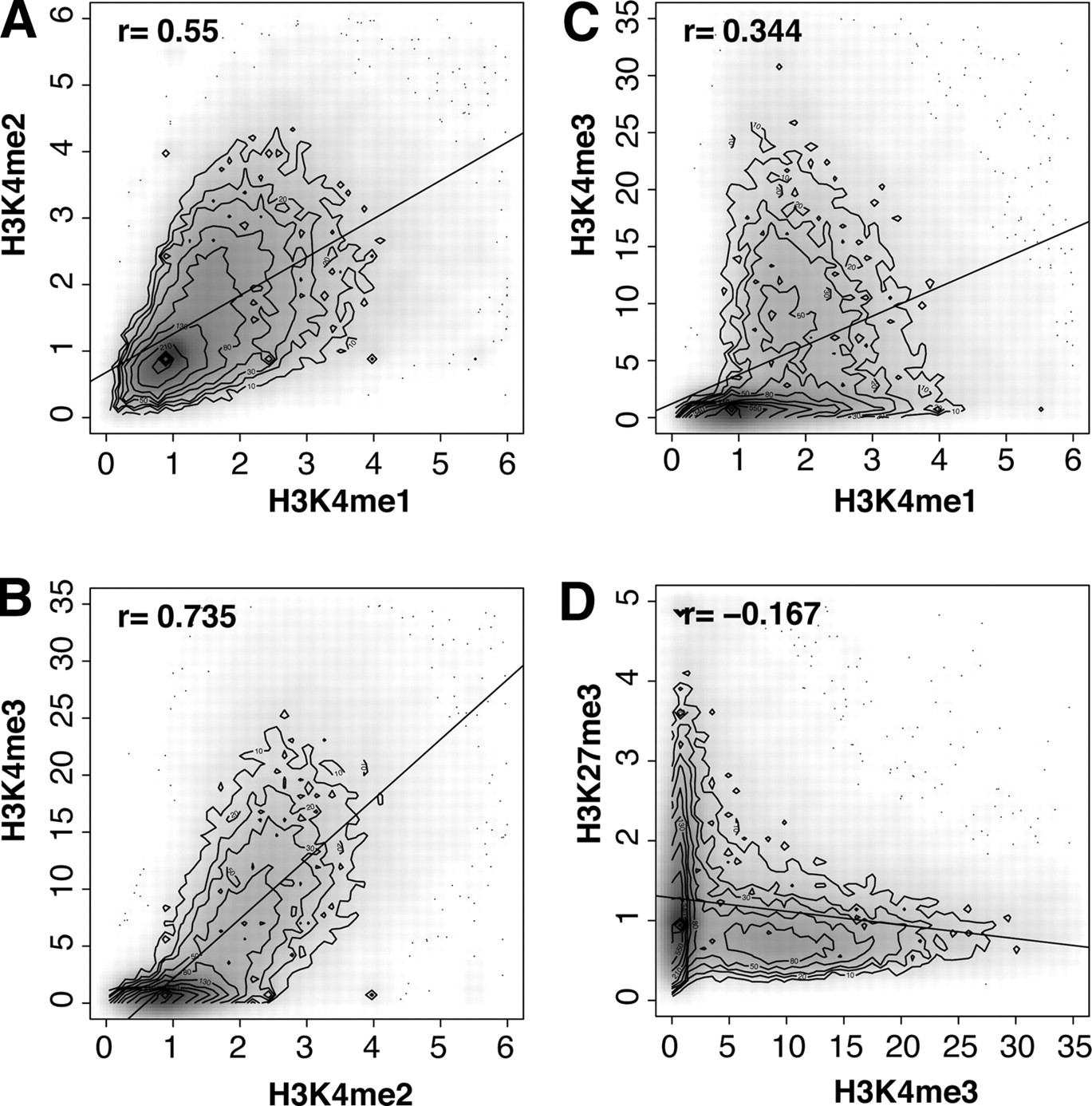 Co-occurrence of input-normalized histone modification near the promoters (0–2000 bp) in human islets: (A) H3K4me2 vs. H3K4me1, (B) H3K4me3 vs. H3K4me2, (C) H3K4me3 vs. H3K4me1, and (D) H3K27me3 vs. H3K4me3. (A–C) The H3K4me1,2,3 series tends to either be completely absent (values near 1), or to co-occur (values near the diagonal). (D) H3K27me3 and H4K4me3 tend not to co-occur, with a few exceptions (bivalent genes).