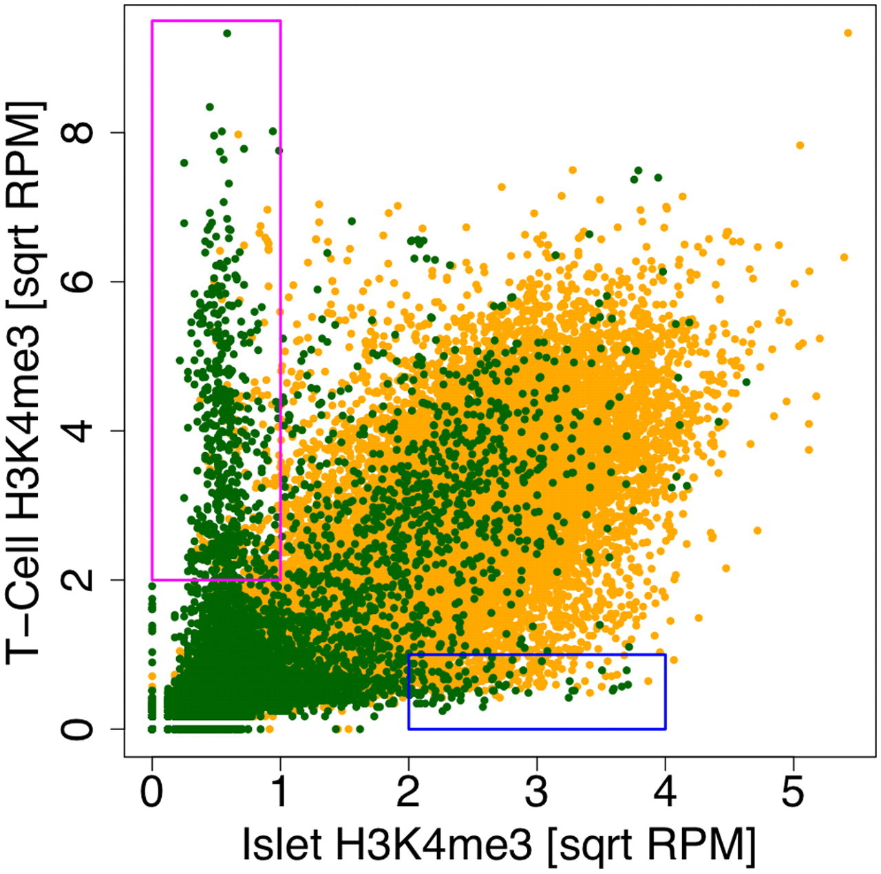 Comparison of H3K4me3 at gene promoters in human islets and CD4+ T-cells. The square root of the summary input-normalized levels of H3K4me3 for CpG island-containing (yellow) and CpG island-less (green) genes are plotted. The CpG island-less genes in the magenta (395 genes) and blue (93 genes) boxes are modified only in one tissue or the other, indicating that this class of genes exhibits tissue-specific promoter modification.