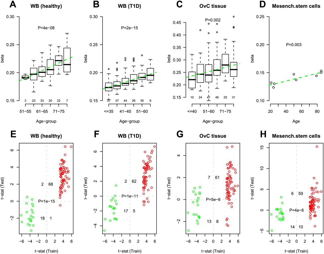 External validation of specific age-associated PCGT DNAm signature. (A–D) Average beta-methylation values over the 69 age-hypermethylated PCGTs (y-axis) as a function of age (x-axis) in validation data sets. Number of samples in each age group are given above the x-axis. t-test P-values for linear trend derived from a robust linear regression are given; (green dashed line) best linear fit. (E–H) Validation of age-associated (69 hypermethylated and 20 hypomethylated) PCGT CpGs in test sets. (X-axis) t-statistic of the linear regression test of age vs. methylation in the training set (blood samples from 148 healthy + 113 pretreatment ovarian cancer cases). Colors reflect directionality: (red) hypermethylated, (green) hypomethylated. (Y-axis) t-statistic of the linear regression test of age vs. methylation in the test set. We provide the number of CpGs displaying significant hyper/hypomethylation in the training set and hyper/hypomethylation in the test set, as well as the corresponding Fisher's exact test P-value. (A,E) Test set of blood samples from an independent set of 108 healthy individuals spanning an age range of 50–80 yr. In A, age was categorized into six age groups (50–55, 56–60, 61–65, 66–70, 71–75, >75). (B,F) Test set of blood samples from 188 T1D patients spanning an age range of 24–74 yr. In B, age was categorized into six age groups (≤35, 36–40, 41–45, 46–50, 51–60, >60). (C,G) A test set of ovarian cancer samples from 177 ovarian cancer patients spanning an age range 24–88 yr. In C, age was categorized into six age groups (≤40, 41–50, 51–60, 61–70, 71–75, >75). (D,H) A test set of eight bone marrow mesenchymal stromal cell samples from healthy donors of the following ages: 21, 24, 25, 50, 53, 79, 85, 85 (Bork et al. 2010).