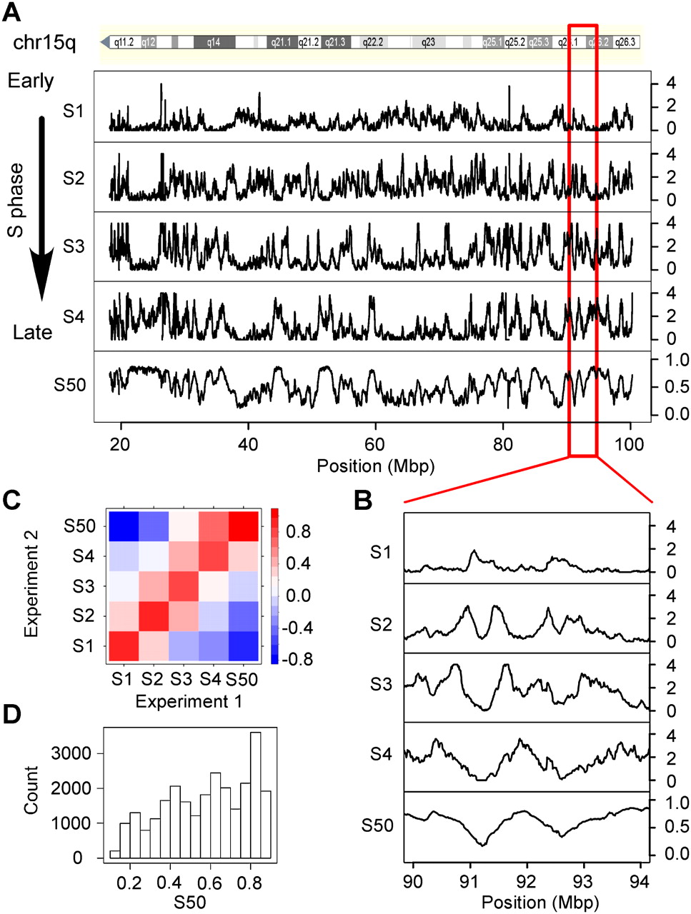 Analysis of the replication timing profiles. (A) Profile along human chromosome 15q of the enrichment of sequence reads E computed in 100-kb windows, in four periods of the S phase, S1, S2, S3, S4; S50, profile of the replication timing values (Methods). Small S50 values correspond to early replicating regions; large S50 values correspond to late replicating regions. (B) Enlarged view of E and S50 profiles along a fragment of chromosome 15. (C) Pairwise correlations (Pearson) between the enrichment E determined in the Si periods of the S phase and the S50 values of Experiments 1 and 2. Colors indicate the range of correlation coefficient values; positive correlations are observed only between neighboring Si fractions; S50 values are negatively correlated with S1 and positively correlated with S4. This confirmed that different alleles of the same region were usually replicated at similar periods of the S phase (Farkash-Amar et al. 2008). (D) Histogram of S50 values in the whole genome.