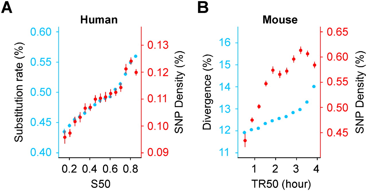 Increase in human and mouse non-CpG divergence and diversity during the S phase. (A) The human global substitution rate (blue) and diversity (Levy et al. 2007) (red) as a function of replication timing. The relative increase in the human global rate as a function of timing (28%) is the same as the relative increase in diversity (29%). (B) (Blue) Mouse–rat divergence; (red) mouse diversity; the relative increase of mouse divergence (16%) is smaller than that of diversity (30%). This likely results from substitution saturation due to long evolutionary time since the mouse/rat divergence. Correlation coefficients (Pearson): human diversity and timing (R = 0.23, P < 10−16); mouse diversity and timing (R = 0.21, P < 10−16). All rates are determined in 100-kb windows.