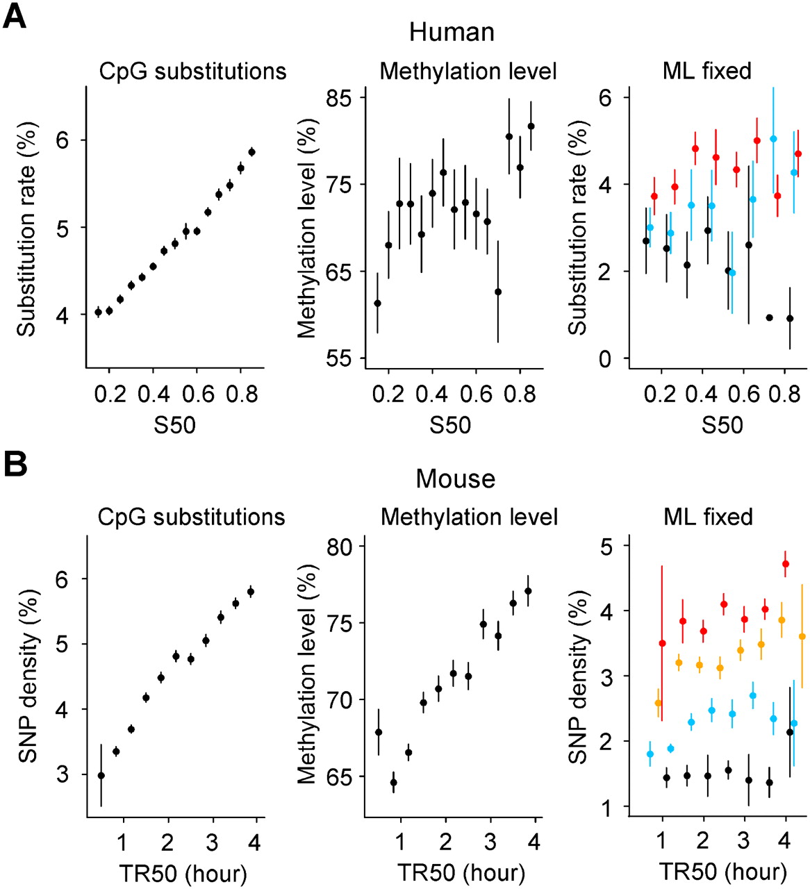 Increase of human and mouse CpG substitution rates in later-replicating regions explained by the increase in methylation level. Replication timing and CpG substitution rates are determined in noncoding regions excluding CpG islands (Methods). (A, left) Human CpG substitution rate as function of S50; (center) methylation level determined in human sperm cells (Eckhardt et al. 2006) plotted as a function of the replication timing S50; (right) human CpG substitution rate when controlling for methylation level (ML). (Black) ML ≤ 20%; (blue) 20% < ML ≤ 60%; (red) ML > 60%. (B) Analyses performed with mouse replication timing data TR50 (Farkash-Amar et al. 2008). (Left) Mouse CpG diversity was computed with SNP data (The International HapMap Consortium 2007); (center) methylation level determined in mouse embryonic stem cells (Meissner et al. 2008) plotted as a function of replication timing; (right) Mouse CpG SNP density when controlling for ML. (Black) ML ≤ 45%; (blue) 45% < ML ≤ 60%; (orange) 60% < ML ≤ 70%; (red) ML > 70%. DNA methylation levels, substitution rates, divergence, and replication timing were computed as indicated in Methods. The window size is as indicated in Methods (DNA Methylation section).