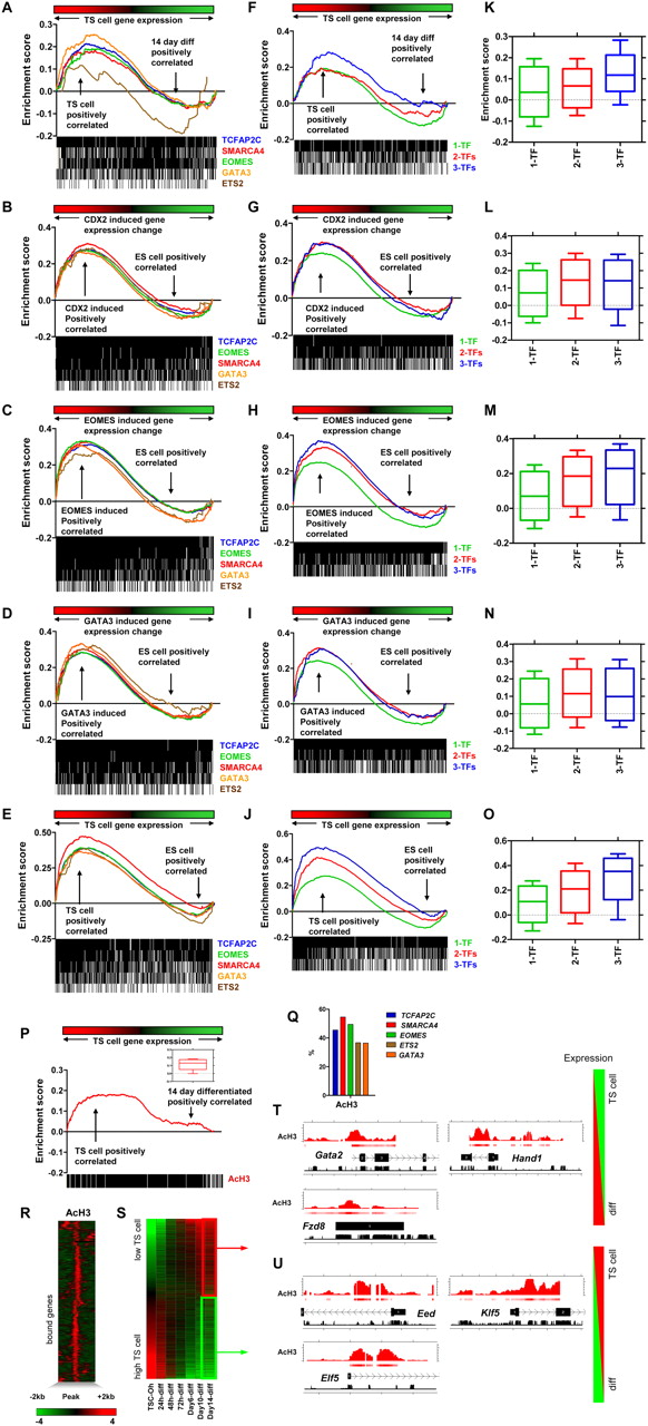 GSEA analysis of TF occupied genes and histone H3 acetylation (AcH3) in TS cells. GSEA analysis of TF target genes in undifferentiated and differentiated TS cells (A); Cdx2- (B), Eomes- (C), and Gata3-overexpressing (D) ES cells; and TS cells and ES cells (E). The majority of target genes are expressed higher in undifferentiated compared with differentiated TS cells, and Cdx2-, Eomes-, and Gata3-overexpressing ES cells compared with control ES cells, and TS cells compared with ES cells. The x-axis represents enrichment of gene expression in TS cells at 0 h through 14 d of differentiation (A); Cdx2- (B), Eomes- (C), or Gata3-overexpressing (D) ES cells compared with control ES cells; or TS cells compared with ES cells (E). Target genes are represented as a black and white heat map below the plot. (F–J) GSEA analysis of multiple versus single factor-occupied genes in TS cells. Expression of genes that are common targets of three and two factors is more enriched in TS cells (F); Cdx2- (G), Eomes- (H), and Gata3-overexpressing (I) ES cells; and TS cells compared with genes occupied by a single factor (J). (K–O) Distribution of enrichment scores of multiple factor-occupied genes in TS cells (K); Cdx2- (L), Eomes- (M), and Gata3-overexpressing (N) ES cells; and TS cells (O). (P) GSEA of AcH3 associated genes in undifferentiated and differentiated TS cells. Expression of AcH3 associated genes is enriched in undifferentiated TS cells. The x-axis represents enrichment of gene expression in TS cells at 0 h through 14 d of differentiation. Inset shows the distribution of enrichment scores of AcH3 associated genes in TS cells. (Q) Association between AcH3 marks and binding of TFs. (R) Profiles of AcH3 marks were centered on enrichment peaks [−2 kb, +2 kb] and clustered. (S) Heat map of TS cell transcriptome data sorted by the level of gene expression in TS cells at 0-h genomic profiles of AcH3 marks at genes expressed at low (T) and high (U) levels in undifferentiated versus differentiated TS cells. MA enrichment values adjusted to log2 and conservation are shown on the plot.