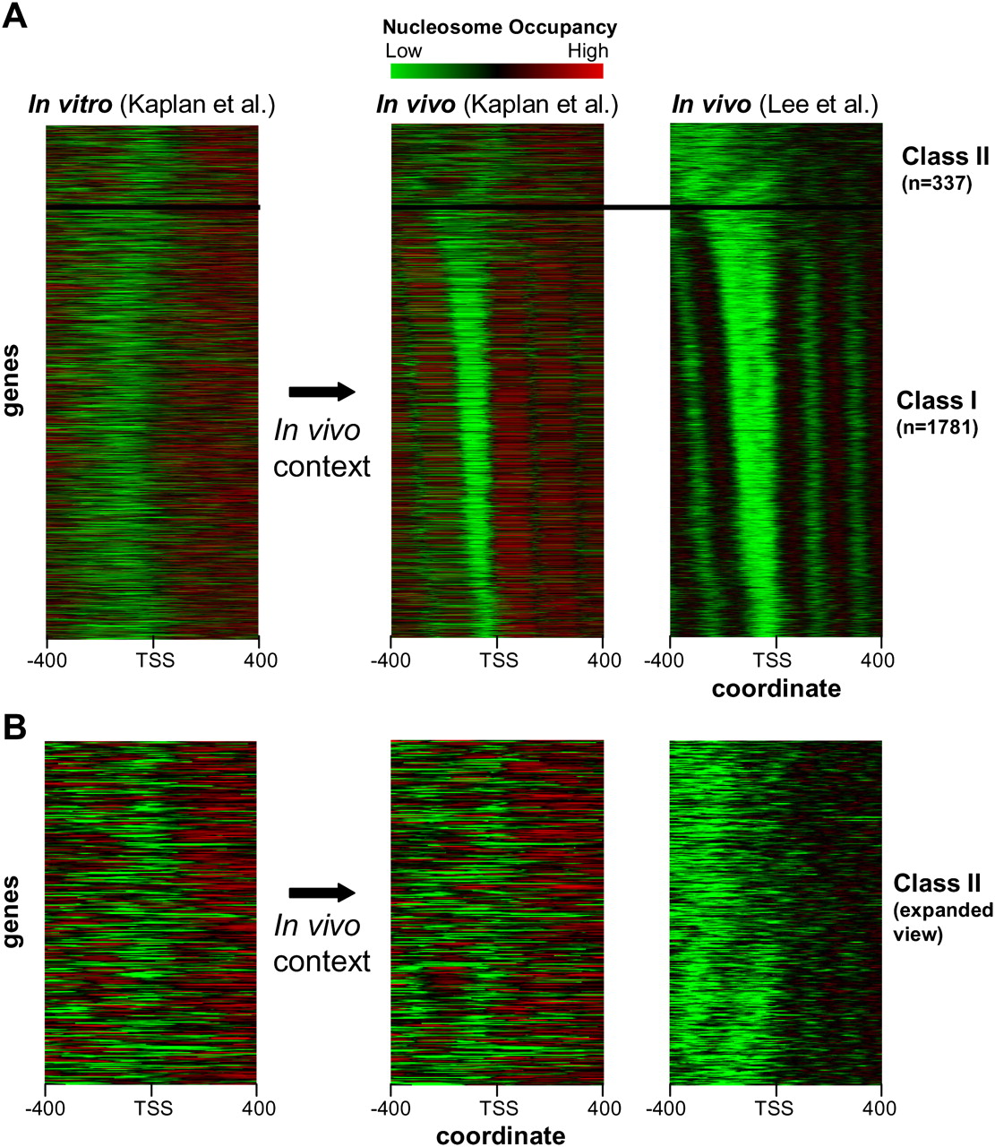 Comparison of in vitro and in vivo nucleosome maps at yeast promoters. (A) Nucleosome maps from tiling array data (Lee et al. 2007) for 2118 S. cerevisiae promoters were clustered using a self-organizing map (SOM) and visually partitioned into two groups (class I and class II). In vivo and in vitro nucleosome maps (Kaplan et al. 2008) were ordered according to the SOM. Maps were aligned according to transcriptional start sites determined using tiling arrays (David et al. 2006). (B) Close-up of the class II promoter class.