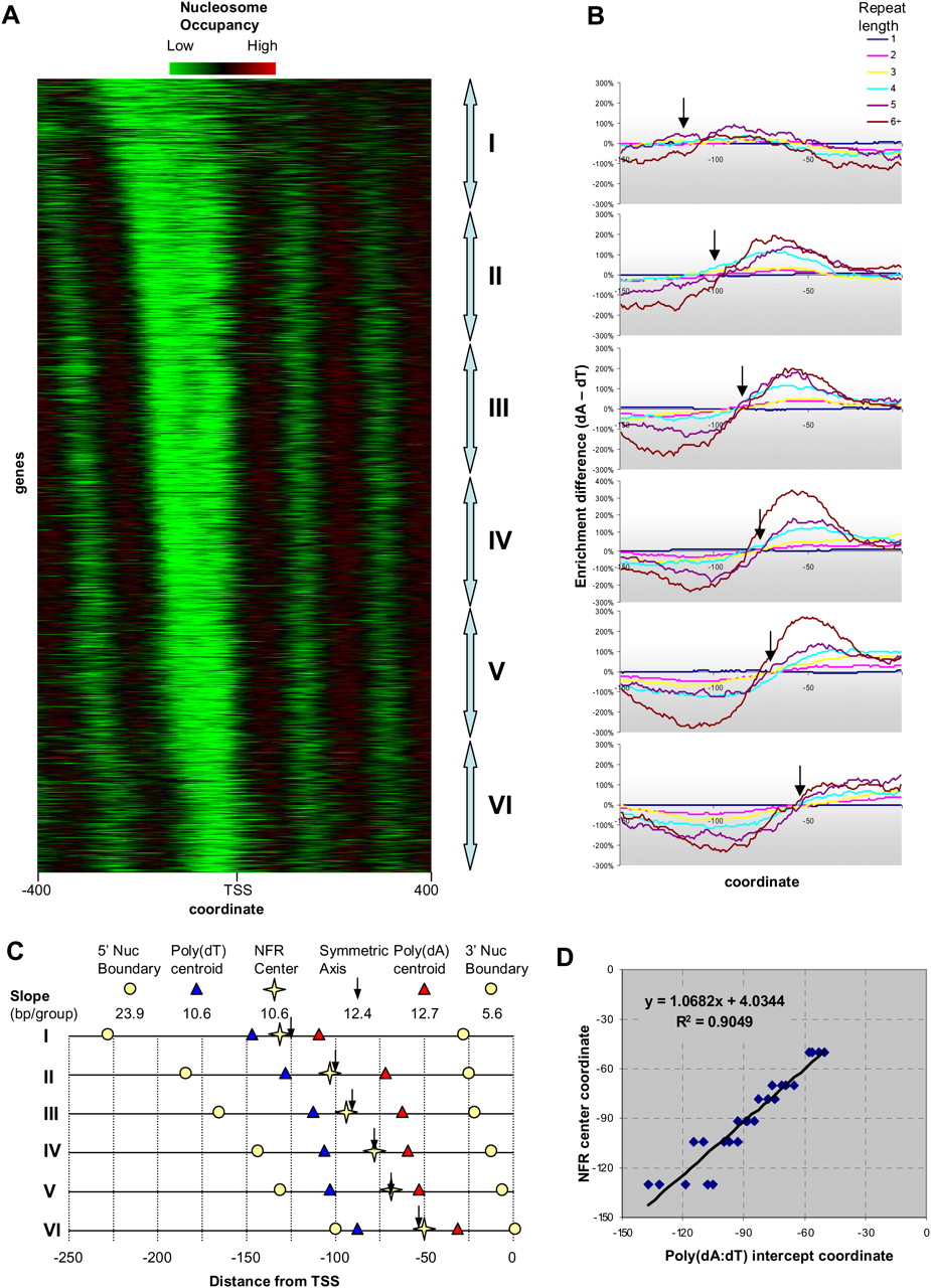 Poly(dA:dT) tracts track fine variations in NFR positions. (A) The class I promoters, which show a progressive narrowing of the NFR, are divided into six equal subgroups, I–VI. (B) Poly(dA:dT) tract enrichment differences for each subgroup. Arrows denote locations of symmetric axes for individual subgroups. (C) Schematic summary of the locations of six promoter elements in each promoter subgroup. Slopes are derived by linear regression and represent the average number of base pairs an element shifts per subgroup of promoters. (D) Plot of NFR center coordinates versus poly(dA:dT) intercept coordinates. Multiple points for each subgroup represent intercepts for different tract length.