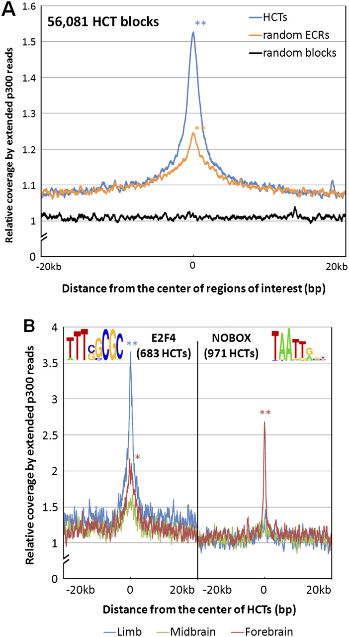 The enhancer activity of HCTs is supported by their association with the enhancer coactivator protein Ep300 in mouse. (A) Mouse HCTs corresponding to all human HCTs for 273 PWMs were combined into 56,081 regions (median size, 549 bp). Their Ep300 coverage profile was constructed by overlapping a total of 9,519,543 Ep300 reads with 40-kb regions centered on the middle point of HCTs. Even though ECRs are known to be significantly associated with Ep300 (P = 0), HCTs show an even stronger association by the means of a significantly higher Ep300 peak (P = 0). (B) Ep300 coverage profiles for HCTs of specific TFs and tissues reveal tissue-specific activity for certain TFs. For example, the coverage profile of 683 E2F4 HCTs reveals a peak significantly higher in limb than in either forebrain (P = 1.4 × 10−21) or midbrain (P = 1.2 × 10−40), while the difference between the forebrain and midbrain coverage is only marginally significant (P = 9.7 × 10−6). In the case of the 971 NOBOX HCTs, their coverage is significantly higher in forebrain than in either limb (P = 2.7 × 10−27) or midbrain (P = 7.3 × 10−43), while limb and midbrain coverage are not significantly different from each other (P = 0.07). These data strongly suggest a limb-specific activity for E2F4 HCTs, and a forebrain-specific activity for NOBOX HCTs. Statistical significance was evaluated with Fisher's exact test, as in Visel et al. (2009);*P < 0.01; **P < 10−20.