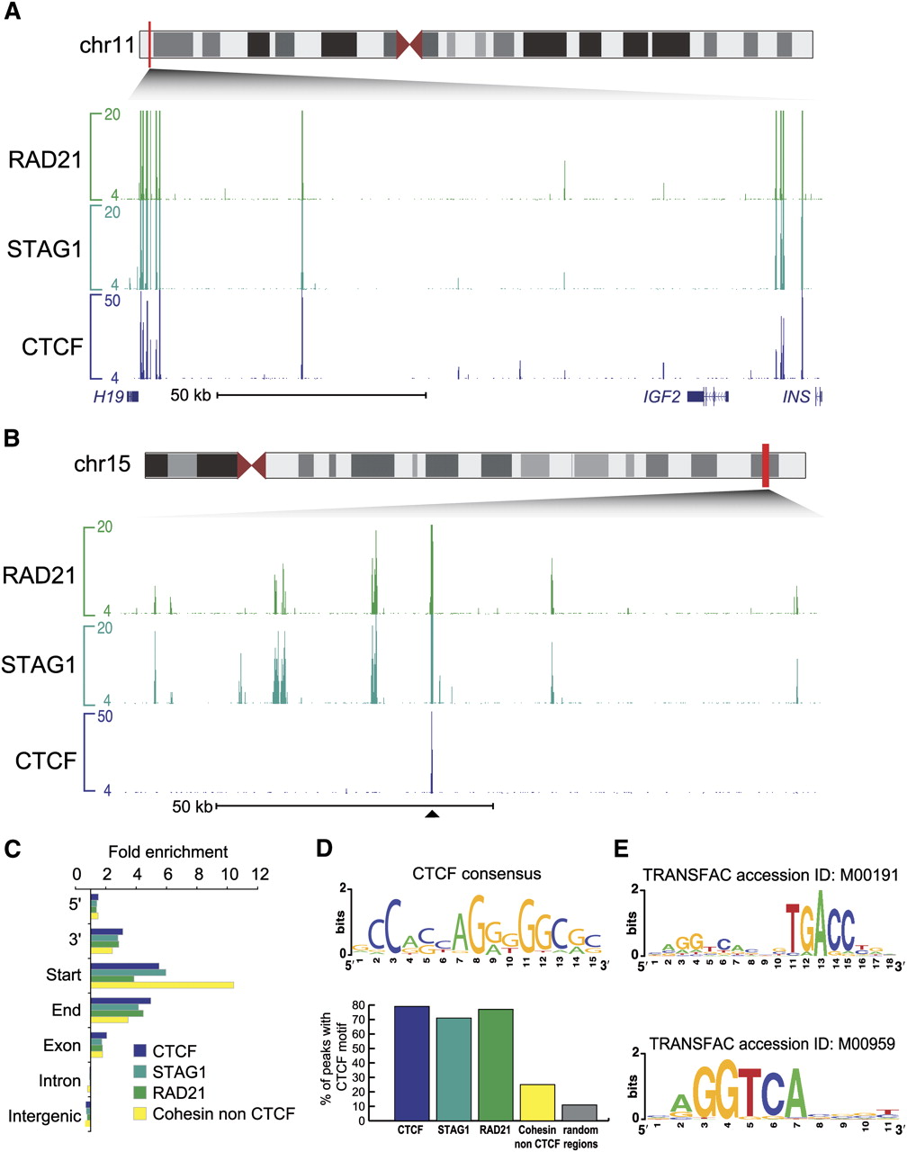Identification of CTCF-independent cohesin binding events in the human genome. (A) Genomic binding of the cohesin subunits RAD21 and STAG1 as well as CTCF shows colocalization at the H19/IGF2 locus in MCF-7 cells. (B) Illustrative CTCF-independent binding events are shown at a 120-kb region on chromosome 15 in MCF-7 cells; this genomic track is centered around a single shared cohesin-CTCF site. (C) Distribution of cohesin-, CTCF-, and cohesin–non-CTCF-binding (CNC) events in the human genome: 5′, 3′, start, end, exon, intron, and intergenic regions of Ensembl genes are shown. The number of sites was normalized and displayed as fold-enrichment relative to genome background. (D) CTCF consensus DNA motif de novo derived from the MCF-7 CTCF binding events. The occurrence of the CTCF consensus within the CTCF, STAG1, RAD21, CNC events and random genomic regions are presented. (E) Estrogen response elements enriched within the CNC events.