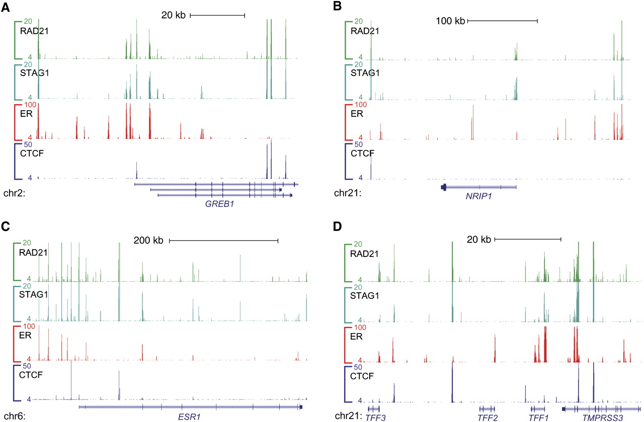 Estrogen receptor, cohesin, and CTCF binding at known estrogen receptor target genes. The genomic binding profiles for cohesin (RAD21 and STAG1), estrogen receptor alpha (ER), and CTCF at four known ER target genes demonstrate extensive co-occupancy of ER and cohesin in the absence of CTCF.