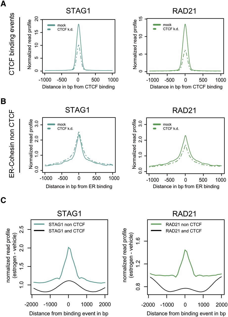 Cohesin binding can be independent of CTCF. (A) Cohesin (STAG1 and RAD21) enrichment at cohesin-CTCF sites is reduced upon CTCF removal by RNAi knockdown (CTCF k.d.). (B) Cohesin enrichment at ER-CNCs is largely unaffected by CTCF knockdown. (C) Cohesin binding increases upon estrogen treatment at sites not shared with CTCF (Kolmogorov-Smirnov, P-value < 10−9 [STAG1]; P-value < 10−15 [RAD21]).
