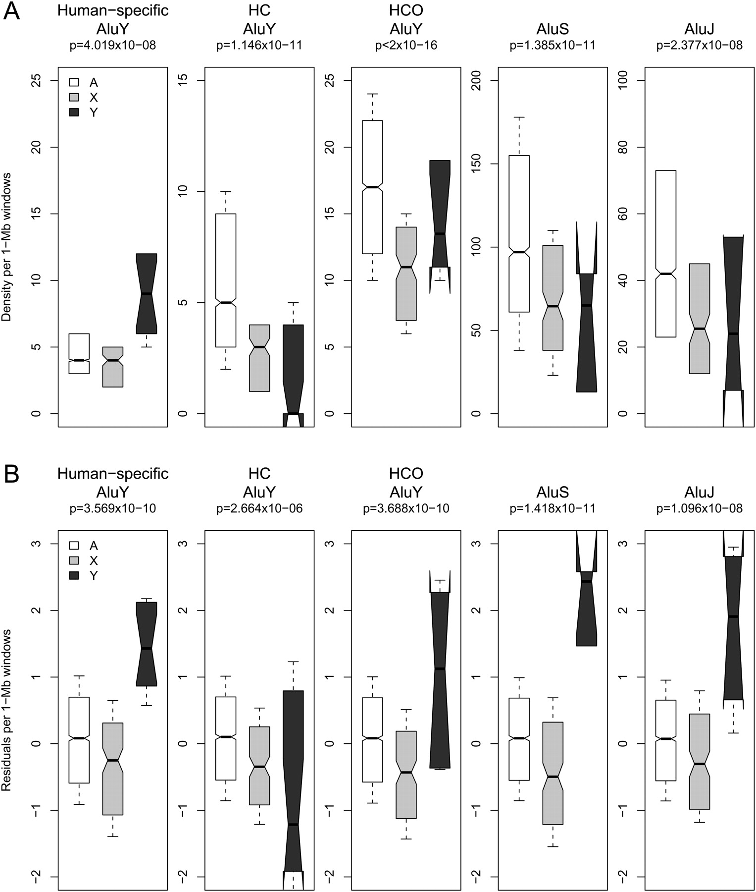Human sex chromosome (X, Y) versus autosome (A) distribution of observed (A) and corrected (B) densities of Alus in 1-Mb windows genome-wide. (A) Observed densities are plotted for Alu elements of various evolutionary ages including human-specific AluYs; human–chimpanzee branch-specific (HC) AluYs; and human–chimpanzee–orangutan branch-specific (HCO) AluYs; AluS and AluJ subfamilies, on the autosomes (white), X (light gray), and Y (dark gray) chromosomes. (B) Residuals from genome-wide multiple regression models represent densities corrected for local variation in genome landscape features. Notches on boxplots indicate the 95% confidence interval of the median.