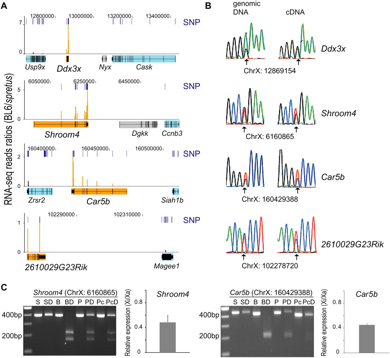 RNA-seq identification of four novel escape genes (Ddx3x, Shroom4, Car5b, 2610029G23Rik). The escape genes are shown with six adjacent genes subject to X inactivation (Usp9x, Cask, Ccnb3, Zrsr2, Siah1b, Magee1). (A) RNA-seq data are graphed as the sequence read ratio (orange bars) between BL6 (inactive X) and M. spretus (active X) at each SNP (short, dark-blue bars) identified in the four escape genes (filled in orange). A few SNPs had ratios higher than those at the maximum scale (Supplemental Table S1). Flanking genes subject to X inactivation (filled in light blue) have very low BL6/spretus ratios. The inactivation status of the genes filled in gray is unknown due to the absence of expressed SNPs. Data were uploaded into the UCSC Genome Browser (Mouse July 2007 [mm9] assembly). (Top) Chromosome X coordinates. (B) Validation of SNPs and of bi-allelic expression of the escape genes by conventional sequencing of PCR and RT-PCR products. Chromatograms are shown for genomic DNA and cDNA with SNP coordinate underneath. (Arrows) Heterozygous bases. (C) Quantification of escape level of Shroom4 and Car5b. Genomic DNA and cDNA were amplified by PCR, followed by restriction endonuclease digestion. Products were separated by gel electrophoresis as shown in the gel pictures (SNP coordinate on top). (S) M. spretus DNA; (SD) M. spretus DNA digested; (B) BL6 DNA; (BD) BL6 DNA digested; (P) Patski genomic DNA; (PD) Patski genomic DNA digested; (Pc) Patski cDNA; (PcD) Patski cDNA digested. Graphs at right of the gels show relative expression levels from the inactive X (Xi) versus the active X (Xa) after real-time qPCR analyses.
