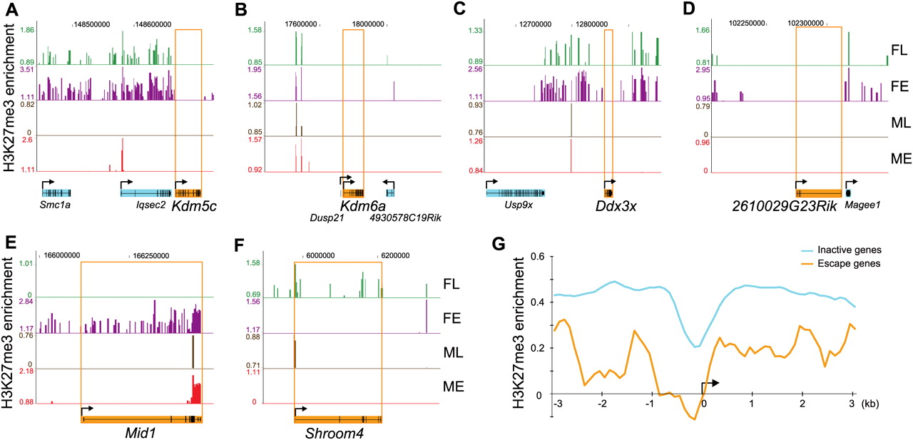 H3K27me3 is usually depleted at escape genes in female tissues. (A–D) Escape genes Kdm5c, Kdm6a, Ddx3x, and 2610029G23Rik are completely devoid of H3K27me3 in female tissues, while adjacent genes subject to X inactivation (e.g., Iqsec2, Magee1, Usp9x) are enriched. (E–F) Depletion in H3K27me3 at escape genes Mid1 and Shroom4 differs between tissues/developmental stages. (FL) Female liver; (FE) female embryos; (ML) male liver; (ME) male embryos. ChIP-chip peak files were uploaded in the UCSC Genome Browser (Mouse July 2007 [mm9] assembly). (Top) X chromosome coordinates. Escape genes are filled in orange, and inactive genes in light blue. (Arrow) Transcription direction. (G) H3K27me3 enrichment at the 5′ end of genes subject to X inactivation is higher than at escape genes in female liver. Average H3K27me3 enrichment for genes subject to X inactivation (366 genes; light blue curve) is compared to average enrichment for escape genes (10 genes; orange curve). Data are shown as log2 of the signal ratio between ChIP and input fractions for 3 kb upstream and 3 kb downstream of the transcription start site (black arrow).