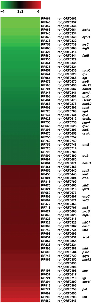 Transcriptional profile of Rp22 vs. Erus cultured on L929 cells and analyzed by RNA microarray. Regulated genes (fold change ≥ 1.5) in Rp22 as compared with Erus were represented using cluster analysis software.
