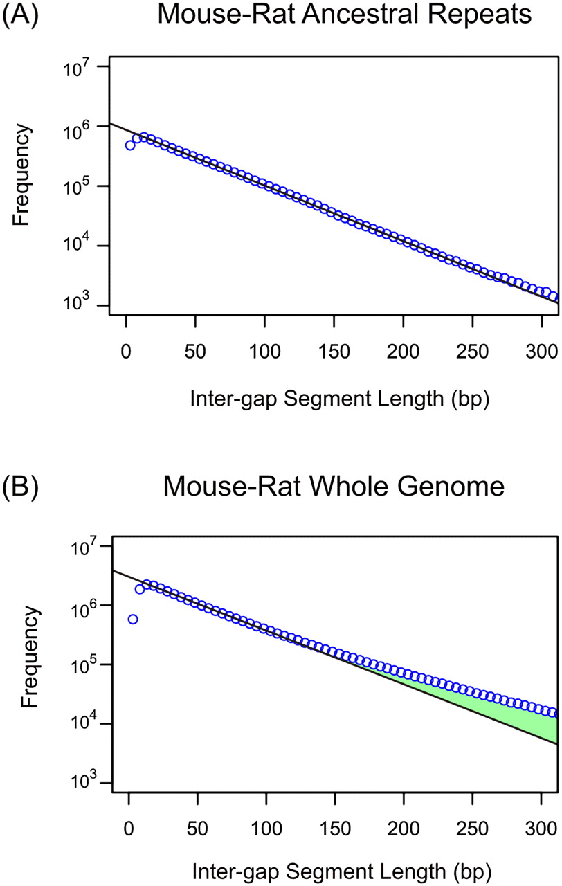 Genomic distribution of intergap segment lengths in mouse-rat alignments for ancestral repeats (A) and whole-genome sequences (B). Frequencies of IGS lengths are shown on a natural log scale. The black line represents the prediction of the neutral indel model, a geometric distribution of IGS lengths; observed counts (blue circles) are accumulated in 5 bp bins of IGS lengths. Within mouse-rate ancestral repeat sequence, the observations fit the model accurately for IGS between 10 bp and 300 bp. For whole-genome data, a similarly close fit is observed for IGS between 10 bp and 100 bp. Beyond 100 bp, an excess of longer IGSs (green) above the quantities predicted by the neutral indel model can be observed, representing functional sequence that has been conserved with regards to indel mutations. The depletion of short (<10 bp) IGS reflects a “gap attraction” phenomenon (Lunter et al. 2008).