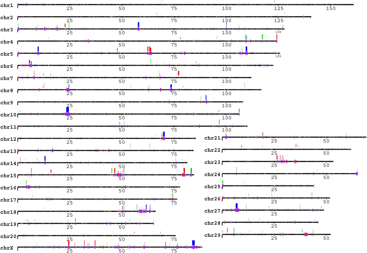 Cattle copy number variation and segmental duplication regions display a local tandem distribution pattern. CNV regions (177 events, 28 Mb, ∼1% of the bovine genome) reported by 90 array CGH experiments are shown above the chromosomes in green (gain), red (loss), and dark blue (both). The bar height represents their frequencies: short (appeared in 1 sample), median (≥2 samples), and tall (≥5 samples). Segmental duplications (94.4 Mb, 3.1% of the bovine genome) predicted by two independent computational approaches are illustrated on the chromosomes in red (WSSD), blue (WGAC), or purple (both). The patterns are depicted for all duplications for ≥5 kb in length and ≥90% sequence identity. The gaps in the assembly are represented on the chromosomes as white ticks. For clarity, distribution patterns with the unassigned sequence contigs (chrUnAll) are shown separately in Supplemental Figure S1.