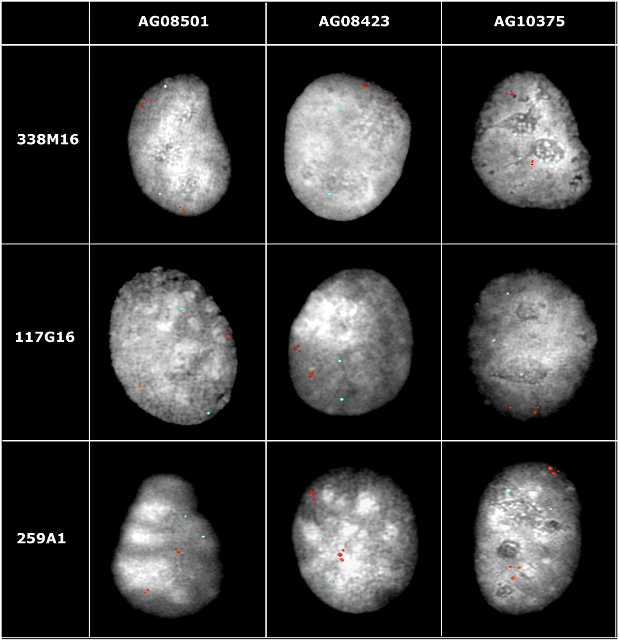 FISH confirmation. Examples of interphase two-color FISH include three BAC clones. Clones 338M16, 117G16, and 259A1 (red) were identified in CNVR31, 56 and 70, corresponding to WC1.1, ULBP17, and ULBP21, and ATP-binding cassette transporter C4, respectively. Increased signal intensity was confirmed using cohybridization with a unique control BAC clone (297K6, blue) in the same nucleus. These BACs produced variable signal count and/or intensity, 338M16: 3, 2, and 2 and 3; 117G16: 2, 2 and 3, and 2 and 259A1: 2, 3, and 3 in these three cell lines, respectively (for summary, see also Supplemental Table S8). Tandem distribution patterns were most frequently observed. The results of all FISH experiments are available online at http://bfgl.anri.barc.usda.gov/cattleCNV/.