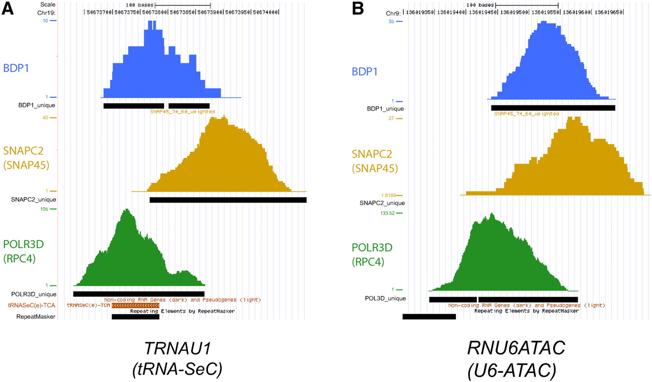 Location of BDP1, SNAPC2, and POLR3D peaks on the TRNAU1 (tRNA-SeC) and RNU6ATAC genes. UCSC Genome Browser views showing the BDP1, SNAPC2, and POLR3D peaks, as well as the unique tag coverage indicating the regions spanned by tags unique within the BDP1, SNAPC2, and POLR3D peaks, respectively. The POLR3D, BDP1, and SNAPC2 visual peak tracks were generated as described in the legend to Figure 3. (A) TRNAU1 (tRNA-SeC) gene. (B) RNU6 snRNA gene.