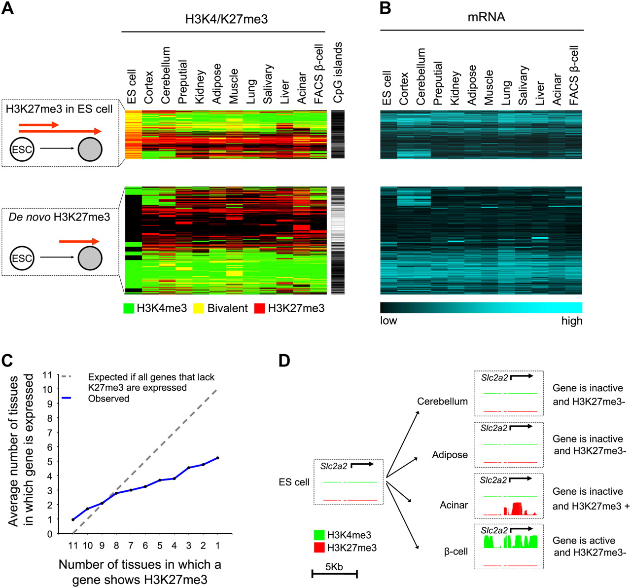Tissue-specific loss and gain of H3K27 methylation. (A) Although many genes that show H3K27me3 enrichment in differentiated cells are also H3K27me3+ in ES cells, unexpectedly 69% of genes only show H3K27me3 enrichment in differentiated tissues (de novo H3K27me3). The cluster representation shows H3K27me3 (red), H3K4me3 (green), or both (yellow) in the 5248 genes that show H3K27me3 in at least one tissue. Genes with de novo H3K27me3 often lack CpG islands, which are indicated as a black line. (B) Most genes with H3K27me3 are inactive (see also Supplemental Fig. S2d). The mRNA heatmap maintains the same order as A. (C,D) H3K27me3 repression is both gene-specific and cell-specific. (C) Genes that are targeted by H3K27me3 in only few tissues are often also inactive in tissues where they do not show H3K27me3. This effect was more pronounced for non-CpG island genes (Supplemental Fig. S2c). (D) The beta-cell glucose transporter Slc2a2 shows H3K27me3 enrichment in acinar cells, yet is inactive in other tissues that lack H3K27me3. The graph shows posterior probability values ranging from 0–1 for the enrichment of H3K4me3 (green) and H3K27me3 (red).