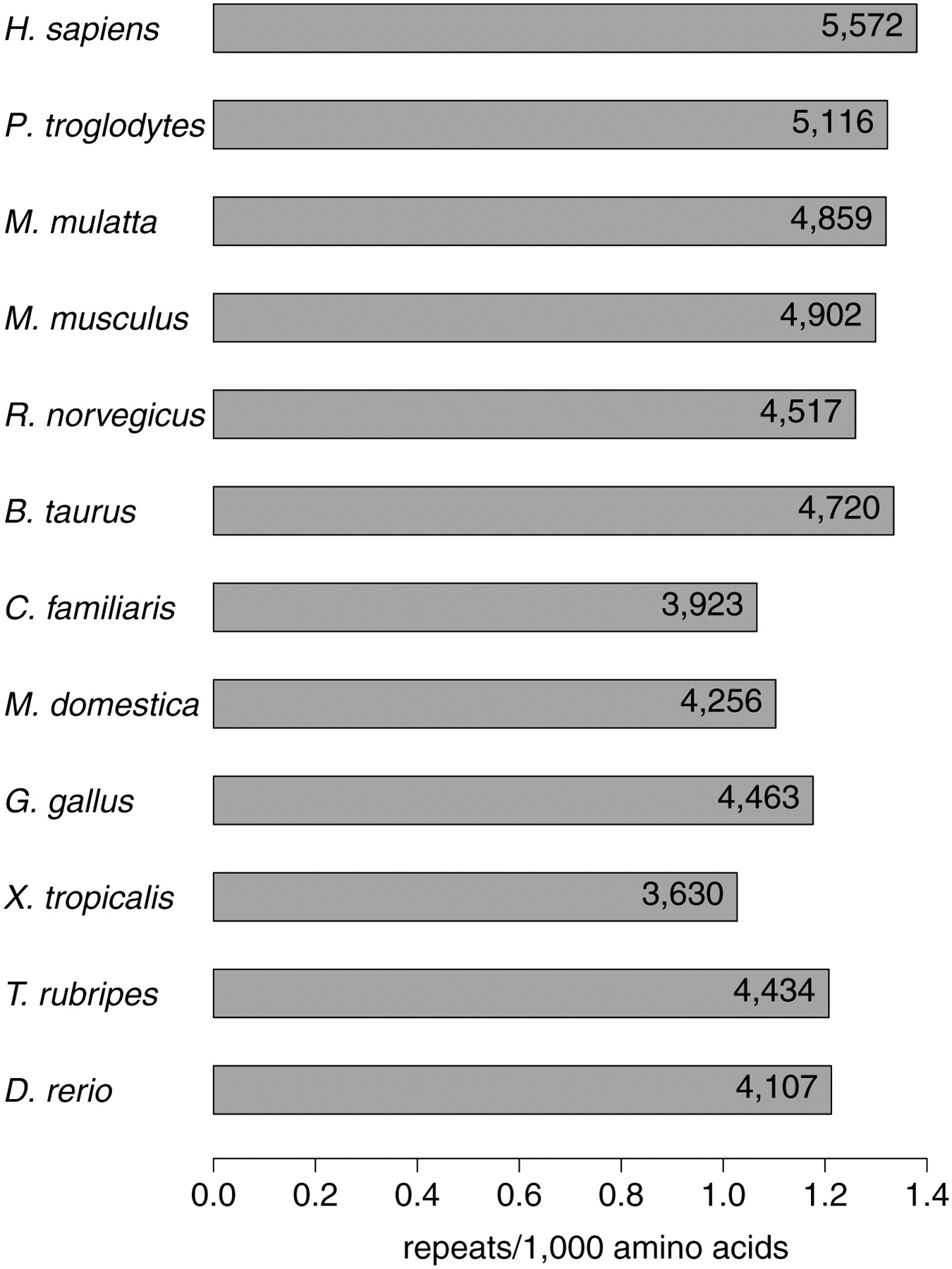 Amino acid repeat abundance in a vertebrate orthologous protein data set. The horizontal axis represents the average number of amino acid tandem repeats of size 4 or longer per 1000 amino acids, in a data set of 6477 one-to-one orthologous proteins. The values inside the bars indicate the total number of amino acid repeats in each species.