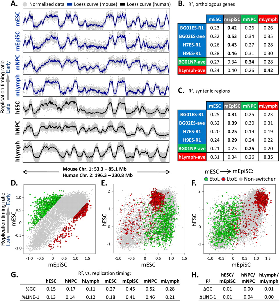 Significant conservation of replication timing between hESCs and mEpiSCs. (A) Example of RT conservation between the indicated human and mouse cell types in one of 207 syntenic regions. (B) Correlation of replication timing (R2 values) between the indicated human and mouse cell types at 16,629 orthologous gene promoters. All mouse data are the averages of biological replicates, while both averaged replicates (ave) and exemplary single replicates (R1) are shown for human cell types. R2 differences ≥0.02 are statistically significant at P < 0.05 using Fisher R-to-Z transformation. (C) 207 syntenic regions >1 Mb were loess smoothed, and RT values were gathered at 100 equal intervals per window to obtain correlations of replication timing in syntenic regions. The significance of these alignments was calculated using bootstrapping (P < 0.0001), as described in the Methods. (D–F) Replication timing for orthologous genes with the top 5% of EtoL and LtoE timing changes in mESCs vs. mEpiSCs (D; [green] EtoL, [red] LtoE, [gray] non-switching) was compared with BG01 hESCs (E,F). Genes that transition from EtoL between mESCs and mEpiSCs generally remain late-replicating in hESCs. (G) Pearson R2 values between domain-wide replication timing and LINE-1 density or GC content are shown for the cell types indicated. Mouse data are from Hiratani et al. (2008, 2010). (H) Conservation (R2) between syntenic regions as in Figure 3C shows little relationship to differences in regional GC or LINE-1 content.