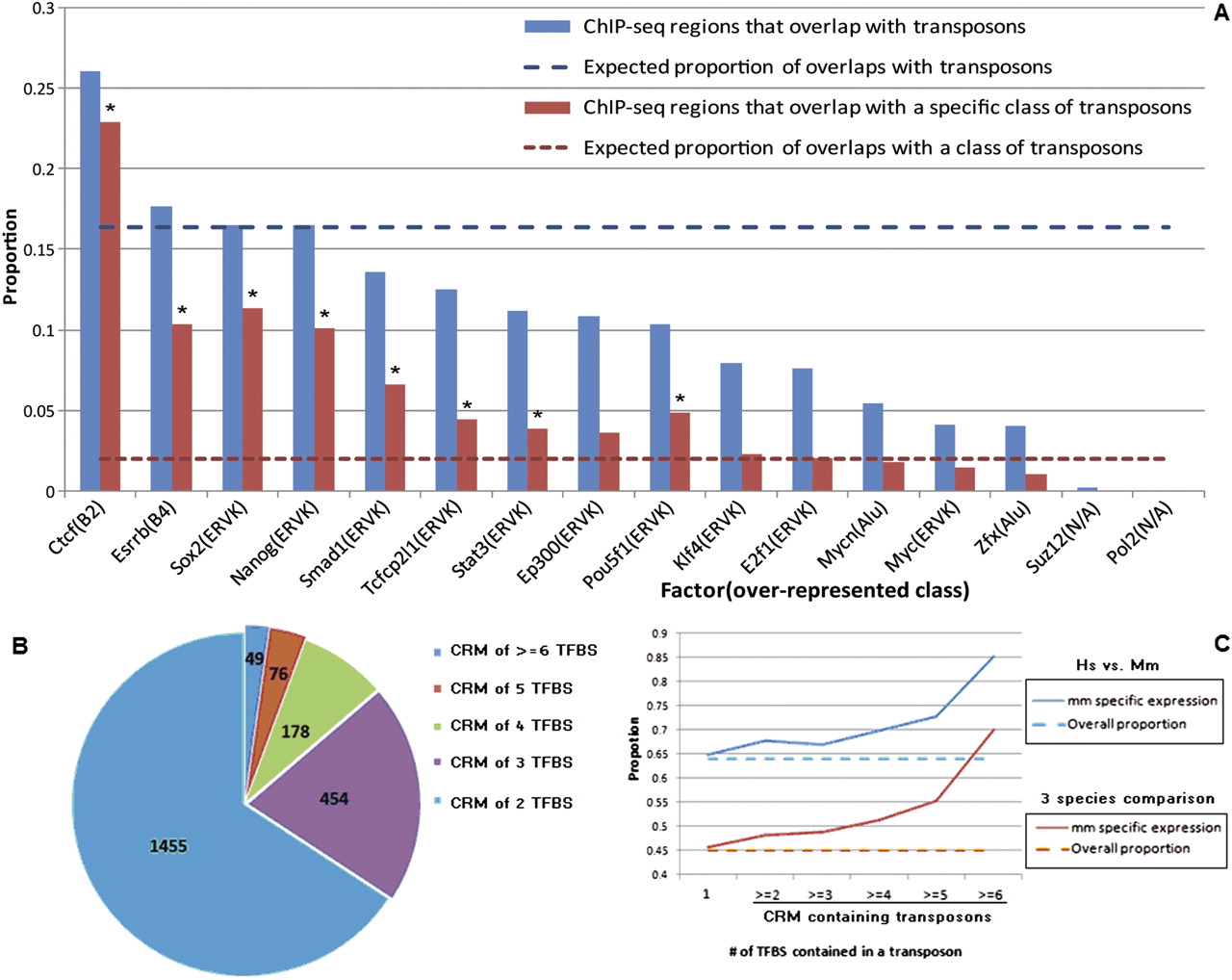 CRM-containing transposons. (A) Proportions of mouse ChIP-seq detected binding regions that overlap with transposons (blue) and a specific class of transposons (red). An asterisk (*) denotes a specific class of transposons that is significantly overrepresented in the ChIP-seq detected regions. (B) Numbers of CRM-containing transposons detected by ChIP-seq. (C) The percentage of transposon-flanked genes with mouse-specific expression (solid lines) and the overall percentage of genes with mouse-specific expression (dashed lines).
