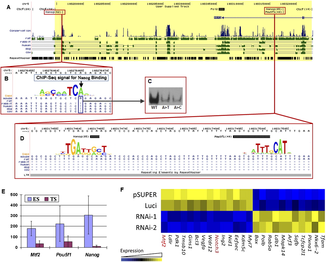 Mouse-specific expression of Mtf2 is due to the creation of transcription factor binding sites produced through the combined effects of a single nucleotide mutation and transposon-introduced sequences. (A) Binding sites for POU5F1, SOX2, NANOG, and RNA Polymerase II lie in close proximity to the mouse Mtf2 gene, between two CTCF binding sites (yellow region). (B) A single nucleotide mutation generates a NANOG binding site in the mouse, but not in human or cow. ChIP-seq data accumulated over 62 sequence reads, overlapping on a single nucleotide in the mouse genome. (C) Electrophoretic mobility shift assay results confirm that mutation of the mouse binding site back to the version in other mammals (A-to-T) eliminates NANOG binding in vitro. (A>T) A-to-T mutation; (A>C) A-to-C mutation. (D) A mouse-specific transposable element inserts a CRM for POU5F1 and NANOG into the region upstream of Mtf2: This CRM is bound by POU5F1 and NANOG in mouse ES cells. (E) Expression levels of Mtf2, Pou5f1, and Nanog in mouse ES and trophoblastic stem (TS) cells. (F) Mtf2 knockdown in mouse ES cells affects the expression of other transcription factors and signaling proteins, including the down-regulation of another ICM-specific gene, Notch3. pSUPER and Luci are control vectors that carry an empty vector (pSUPER) and shRNA against a luciferase gene (Luci). RNAi-1 and RNAi-2 are knockdowns mediated by two different shRNAs.