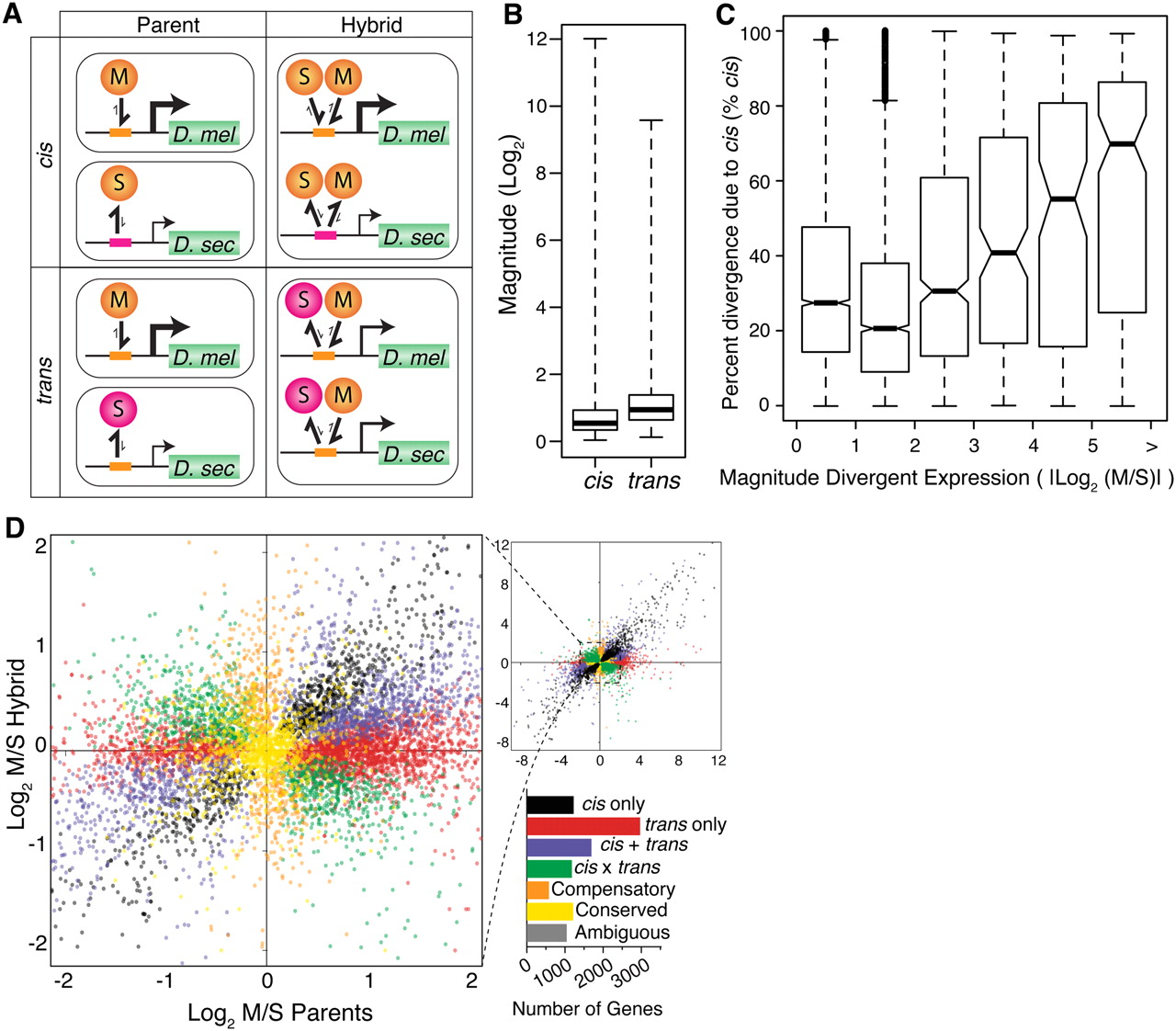 Dissecting cis and trans regulatory differences. (A) Two hypothetical regulatory divergence scenarios are shown. In the top section, a cis-regulatory change in D. sechellia (pink boxes) causes a reduction in affinity for both the conserved D. melanogaster and D. sechellia transcription factors (orange circles). In the bottom section, a trans-regulatory change in a D. sechellia transcription factor (pink circles) reduces its binding affinity for the conserved D. melanogaster and D. sechellia cis-regulatory sequences (orange boxes). The relative expression level is indicated by the promoter arrow thickness. The size of the one-sided arrows show the relative “on” and “off” rates for the transcription factor binding to the cis-regulatory DNA sequence. Note that the cis-regulatory change affects expression of only the D. sechellia allele in F1 hybrids, whereas the trans-regulatory change affects expression of both the D. melanogaster and D. sechellia alleles. (B) Box plots summarize the fold expression differences resulting from cis and trans regulatory divergence. (C) The distribution of percent cis is shown for six groups of genes that differ in the magnitude of total expression divergence between species. Genes were binned based on the absolute value of log2-transformed expression divergence (|log2(M/S)|), and 4086, 2590, 625, 171, 104, and 163 genes were contained within bins 0–1, 1–2, 2–3, 3–4, 4–5, and >5, respectively. Nonoverlapping notches depict statistically significant differences in the median percent cis between pairs of bins. (D) Plot summarizes the relative, allele-specific expression levels in parental and hybrid data sets. Each point represents a single gene and is color-coded according to the mechanism of regulatory evolution inferred from a hierarchical series of statistical tests (FDR = 0.5%; Supplemental Fig. S4). The bar graph depicts the number of genes in each category.