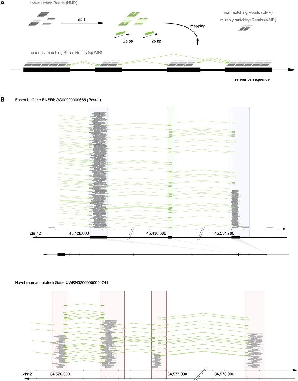 Agnostic splice junction (SJ) mapping. (A) Agnostic, i.e., de novo genome-wide SJ discovery from split reads (25 bp + 25 bp). NMR were split into 25-mer halves, which were matched independently to the genome reference sequence. Reads whose halves each matched uniquely to the genome defined SJs de novo; these were termed uniquely mapping splice junction reads (sjUMR). (B) SJ validation on known genes and their application to define connections of novel exons and exon borders. (Green) SJ-spanning uniquely mapping reads (sjUMR; mapped as described in the Methods section). Most SJs were supported by multiple sjUMR (28.6 on average), as depicted here by piles of green lines. (Top panel) A known gene (Pitpnb ENSRNOG00000000665) is shown here, demonstrating how sjUMR mapped precisely to the border of exons as annotated in the reference genome. (Bottom panel) sjUMR connecting novel UMR clusters to groups, thereby defining new genes. In some instances, UMR cluster borders fall into introns (as a result of the inclusiveness of the sliding-window algorithm), as depicted here (right sides of second and third cluster). In those cases, exon borders were defined precisely by sjUMR. Note (top panel, second exon) that very short (<50 bp) exons that were undetectable by UMR could be defined through mapping of SJ reads.