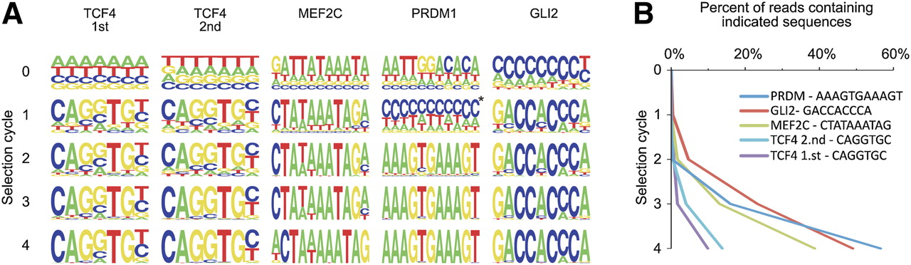 Enrichment of specific sequences during the SELEX process. (A) Position weight matrices built around the most enriched sequence for four different TFs (see Methods for details). The height of the letter at each position is directly proportional to the incidence of the indicated base in sequences where all other bases exactly match the most enriched sequence. Note that clear enrichment of sequences is observed after one or two SELEX rounds, and that two separate experiments for TCF4 result in a very similar enrichment pattern. In the first cycle, the algorithm used here detects incorrect binding profile for PRDM1 (asterisk) due to a low number of the relatively long consensus sequences. The enrichment of high-affinity sequences can, however, be detected by seeding the algorithm with consensus from the later cycles (see Supplemental Fig. S4A). (B) The fraction of all fragments containing the most enriched sequence from the third SELEX cycle plotted as a function of the SELEX cycle.