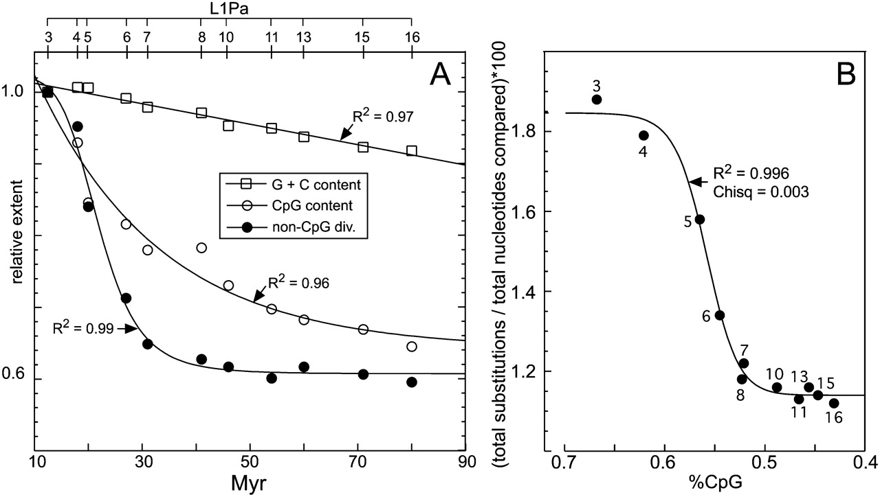 CpG, G + C, and non-CpG mutations. (A) The % (G + C) and CpG contents of the various L1 orthologs and their % non-CpG mutations are normalized to those of L1Pa3 (set as 1) and plotted as a function of L1 family age. The axis at the top of the panel indicates which L1Pa families correspond to the data points in the body of the panel. (B) The % non-CpG mutations are plotted as a function of % CpG content. The non-CpG divergences fit a sigmoidal function of CpG content better than a linear function using either all or subsets of the data (see text and Supplemental Fig. S7). Numbers indicate L1Pa families.