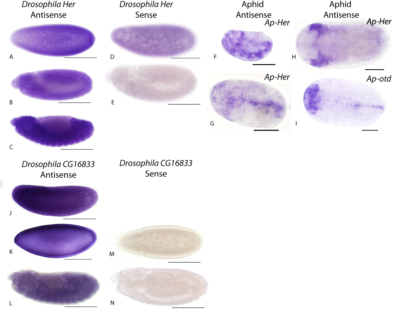 Expression of Drosophila Her, CG16833, and aphid Her. Drosophila embryos stained for Her or CG16833 RNA (blue) using in situ hybridization. Scale bars, 50 μm for panels A–E and J–N. Embryos are oriented anterior to the left, dorsal top. (A–C) Expression of Her RNA in Drosophila embryos detected using in situ hybridization. Her RNA in a stage 5 (A), stage 11 (B), and stage 12 (C) embryo. At all stages Her RNA is ubiquitously distributed. (D,E) Sense controls for Her in situ hybridization stained under the same conditions as A–C. Weak staining is seen in early embryos, up to stage 4 (D); later embryos (E, stage 11) show no significant expression. (F–H) Viviparous aphid embryos stained for Her RNA (ACYPI009737) (blue) using in situ hybridization. All embryos are oriented with anterior to the left. Scale bars, 200 μm for panels F–I. Embryos are staged according to the scheme of Miura et al. (2003) and Chang et al. (2007). (F) At stages 11 and 12 (lateral view) Ap-Her is expressed diffusely throughout the embryonic germband during germband elongation including the presumptive head region. (G) By stage 13 and 14 (ventral view) limb buds are formed and diffuse Ap-Her staining is observed in the head region, with stronger staining observed in cells of the ventral midline as well as some surrounding cells. Expression of Ap-Her is not detected in the fully differentiated CNS. (H) At stage 18 (ventral view) expression of Ap-Her is restricted to tissues associated with the differentiating compound eyes. (I) Ap-otd (also known as oc) expression is shown for comparison. At stage 14 (ventral view) Ap-otd is strongly expressed in the presumptive cephalic regions of the head and in cells of the ventral midline in the developing CNS (Huang et al. 2010). (J–L) Expression of Drosophila CG16833 RNA detected by in situ hybridization. Expression is ubiquitous in all embryos, shown are stage 4 (J), stage 5 (K), and stage 12 (L). (M,N) Sense negative control in situ hybridization for CG16833. No staining is seen at any stage; shown are stage 6 (M, dorsal view) and stage 12 (N).