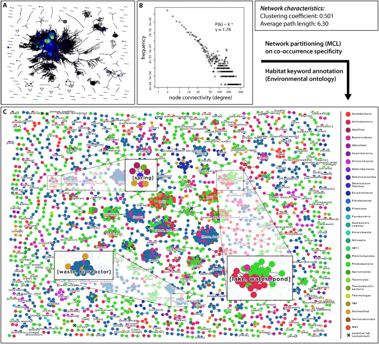 Global network of coexisting microbial lineages. (A) Overview of the network of lineage associations. Each node denotes a microbial lineage, and each line a significant co-occurrence relationship. Node size is proportional to the number of sequences in the lineage, and node color indicates the connectivity degree of a node (along a color gradient: blue, low connectivity; red, high connectivity). Throughout the figure, the OTU definition cutoff is at 97% sequence identity, and the P-value cutoff for an association is 0.001 (i.e., FDR after correction for multiple testing). (B) Connectivity degree distribution plot for the network in A. The distribution is coarsely compatible with a power law distribution. (C) Same network as in A, but partitioned using unsupervised Markov clustering, to reveal modules (clusters) of co-occurring lineages. Here, node color denotes taxonomic classification at the phylum level. Lineages suspected to contain potential laboratory contaminants (Tanner et al. 1998; Barton et al. 2006) are mainly observed in small clusters, and are marked with a small black X (17 such lineages in total).