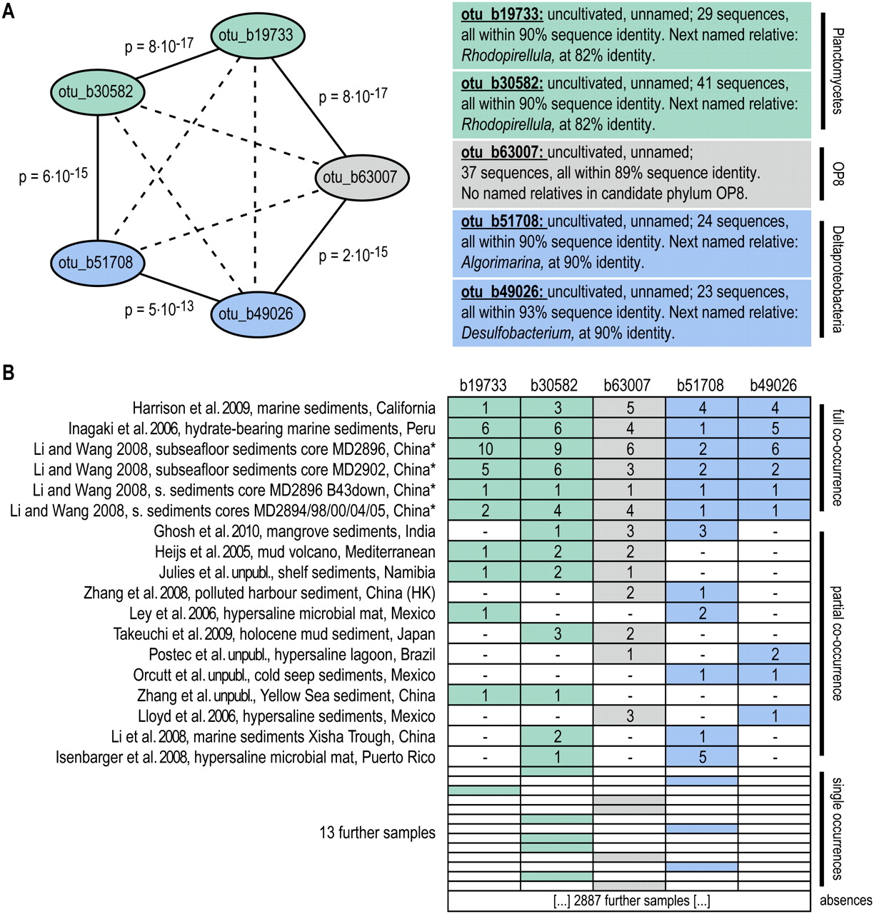 Example of a novel, previously undescribed module of coexisting lineages. (A) Five distinct microbial lineages are shown; they belong to three different phyla and are defined at an OTU-clustering distance of 90% sequence identity at the 16S rRNA gene. The five lineages have been exclusively observed through environmentally sampled sequences and have not been named. (B) The table shows all occurrence counts of these lineages among our sampling data; the P-values indicated have been corrected for multiple testing, against the background of all lineages defined at 90%. Adjusted P-values (FDR; p) and odds ratios (or) are indicated. (*) The samples by Li et al.(2008) have been collected at distinct sites, covering a distance of more than 600 miles; collection was at different water depths and sampling dates. Investigators involved in unpublished work are as follows: E Julies, V Bruechert, and BM Fuchs; B Orcutt, SB Joye, S Kleindienst, K Knittel, A Ramette, A Rietz, V Samarkin, T Treude, and A Boetius; A Postec, R Warthmann, C Vaconcelos, K Hanselmann, and J McKenzie; Z Zhang, H Xiao, and X Tang.