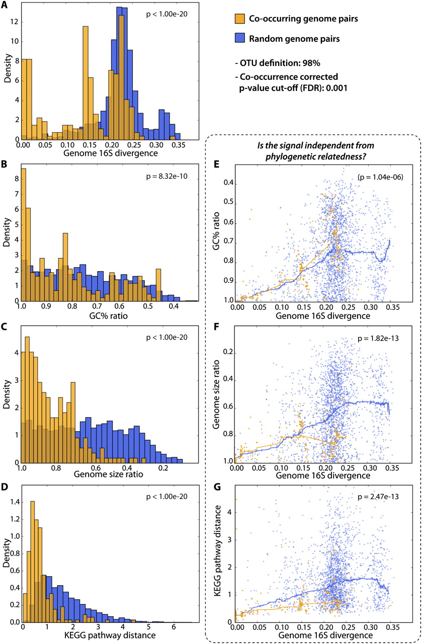 Coexisting lineages display similarities in genomic features. Here, we exclusively focus on co-occurring lineages for which completely sequenced genomes could be mapped to both partners (this genome mapping is globally visualized in Supplemental Fig. S6). Properties of such co-occurring genomes are compared, and contrasted against randomly paired genomes. (A) The distribution of 16S sequence divergence scores; shifted to the left for co-occurring genome pairs (i.e. they tend to be related phylogenetically). In panels E, F, and G, we test for independence between phylogenetic relatedness, and observations as shown in panels B, C, and D, respectively. Here, each dot denotes a pairwise genome comparison, and lines correspond to running medians.