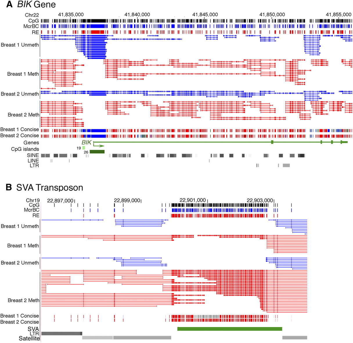 High-resolution genome-wide methylation profiling and genome-wide DNA methylation trends. (A) Browser view of Methyl-MAPS data from the genomic region spanning the BIK gene. Individual mapped sequence reads are shown in the top raw data tracks. Red sequences were resistant to methylation-sensitive restriction endonucleases (RE) and are therefore methylated. Blue sequences were resistant to the methylation-dependent McrBC complex and are unmethylated. Tick marks in both tracks along the top of the figure and within each sequence indicate locations of individual RE and McrBC recognition sequences. Methylation data is also presented in a concise view, where each CpG is assigned a methylation score from the ratio of methylated to total (unmethylated and methylated) sequences covering each CpG site. The bulk of the BIK gene is methylated, while the CpG-rich promoter is unmethylated. (B) Methylation of the SVA retrotransposon in a repeat-rich region of chr 19. While the CpG density is comparable to that of the CpG island of the BIK gene shown in A, the SVA retrotransposon is densely methylated.