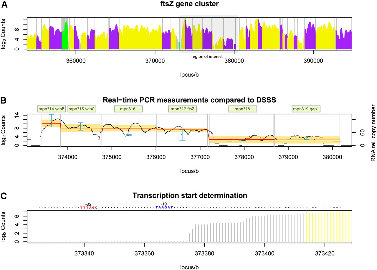 ftsZ gene cluster characterization. (A) Detection of transcription by DSSS in the interval between 355 kb and 395 kb on the forward strand of the M. pneumoniae M129 genome. Protein coding genes are alternately displayed in purple or yellow; genes encoding structural RNA are shown in green. Vertical gray lines separate annotated genes. The gray box at 373–380 kb highlights the ftsZ gene cluster. (B) Real-time PCR expression measurement compared to DSSS. Gene names are indicated in pale green boxes. Blue, transcript copy number estimated from RT-PCR (Benders et al. 2005); black, the DSSS signal; red, the average DSSS signal; orange, the confidence interval of gene expression (DSSS signal ± SD). Note that DSSS signal and RT-PCR measurements overlap in five of six genes. (C) Transcription start site determination with base-pair precision using DSSS. The first signal different from zero is used to determine the transcription start site. Blue, the predicted −10 region; red, −35 region. The result is in agreement with published results from Benders et al. (2005).