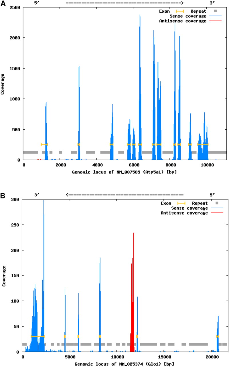Analysis of mouse gene loci by DSSS. DSSS reads were mapped against the repeat-masked genomic mouse sequences plus 1 kbp upstream of and 1 kbp downstream of the gene locus. Exon annotation (yellow) is derived from the mouse genome annotation. The coverage by DSSS reads is shown in blue (sense orientation) or red (antisense orientation). (A) Atp5a1 locus; (B) Glo1 locus. The antisense signal in the Glo1 locus colocalizes with an Rps13 sequence (see text).